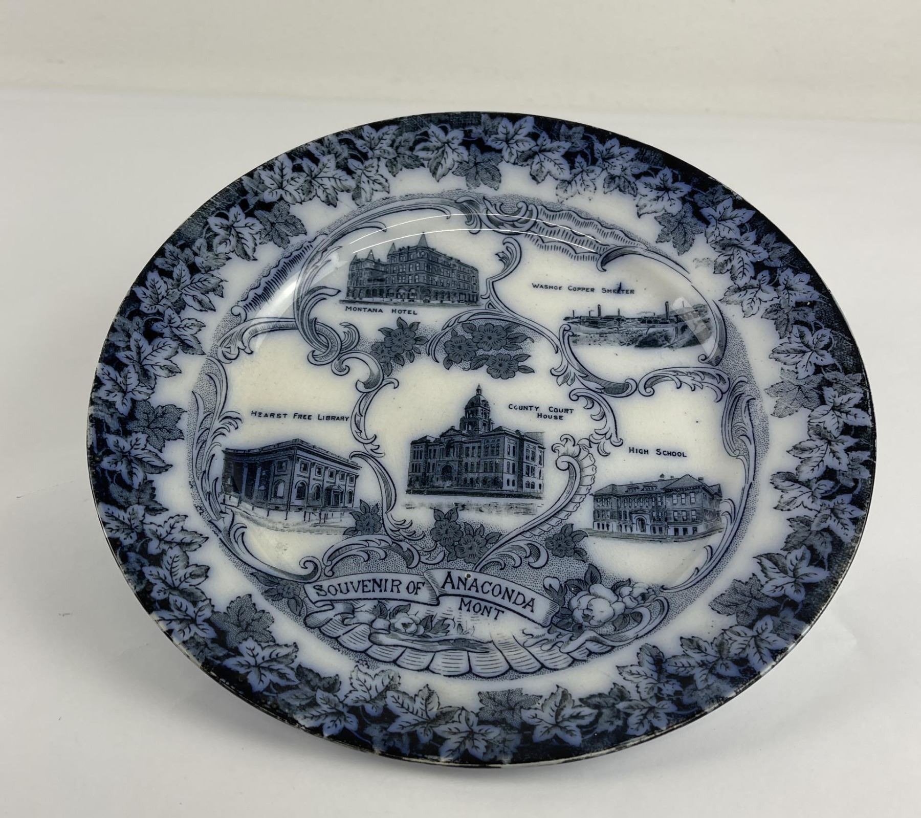 Nice old souvenir plate from Anaconda Montana. Flow Blue. No chips or cracks. 9" diameter