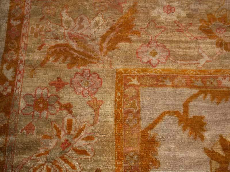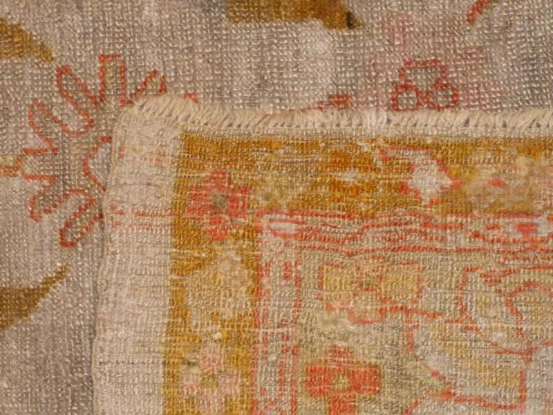 12.04 x 14.11 Circa 1900 Antique Angora Oushak, Turkey - An elegantly drawn pattern of fine vines and palmettes unfolds with consummate grace and perfect symmetry on this supremely lush antique Angora Oushak. The delicacy of the design in matched by the softness of the coloration and the texture of the lustrous Angora Turkish wool. The border adapts the design elements and palette of the field to a linear format, thereby achieving a complete decorative unity and harmony.