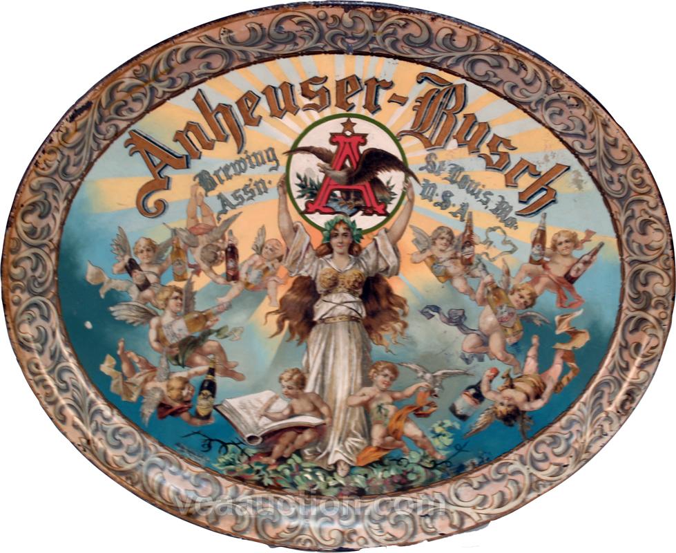 Antique Anheuser Busch Brewing Ass'n. Oval Tin Serving Tray c1900 w/ cherubs, all original - 16" x 14"