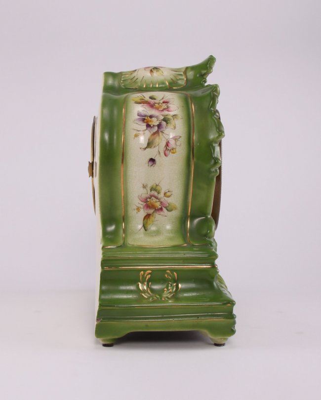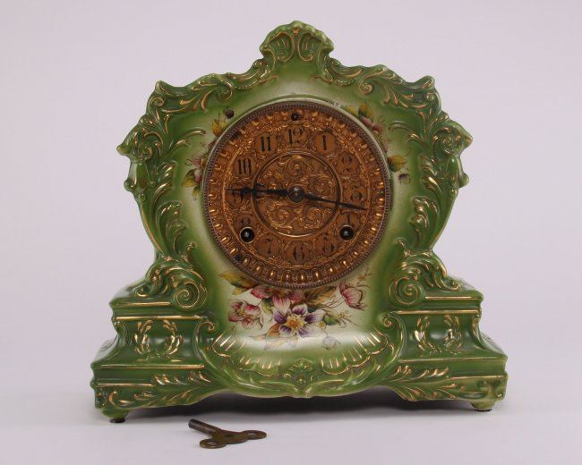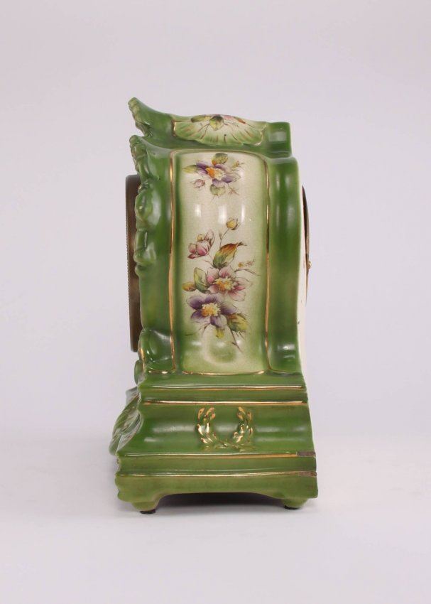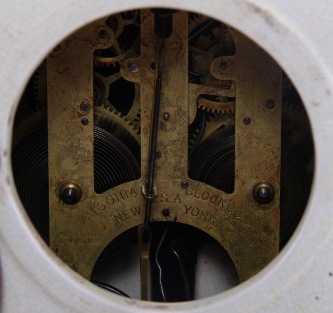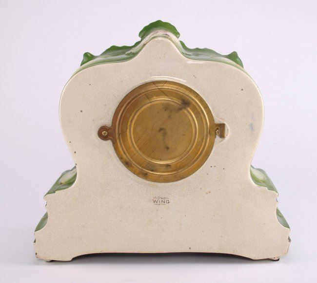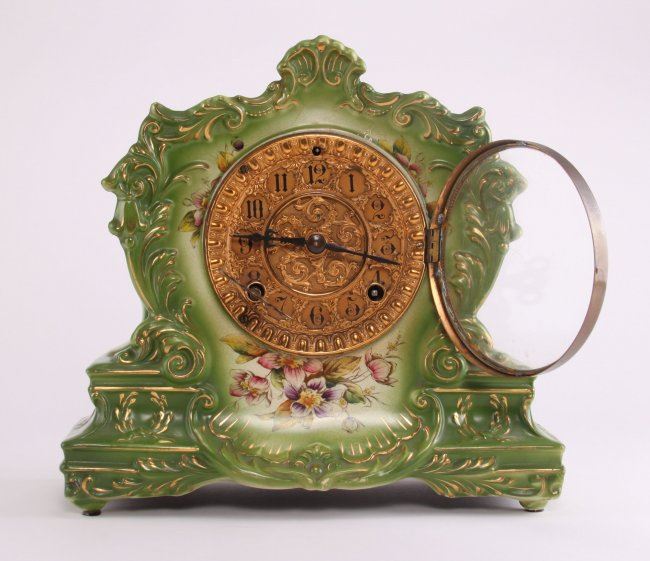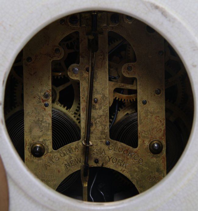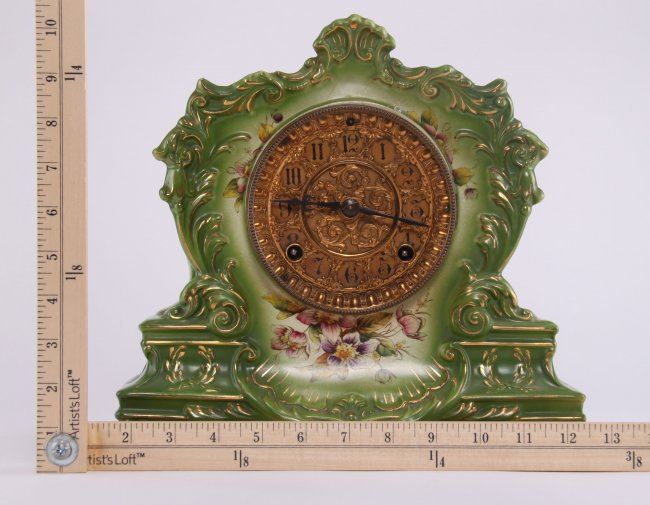 Antique Ansonia Wing Porcelain Mantle Clock. (Size: See second photo for measurement.) Photos are part of the description representing the condition report. Pangaea Auctions urges Bidder's to view all attached photos.