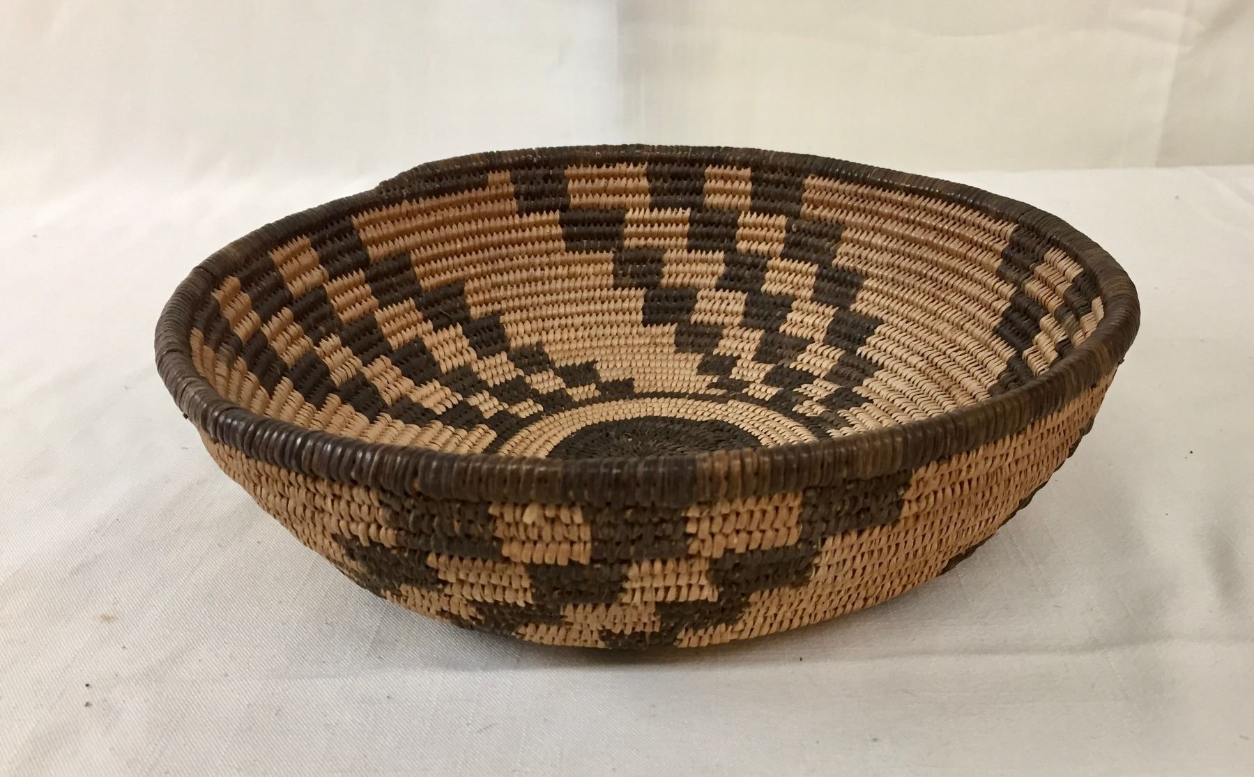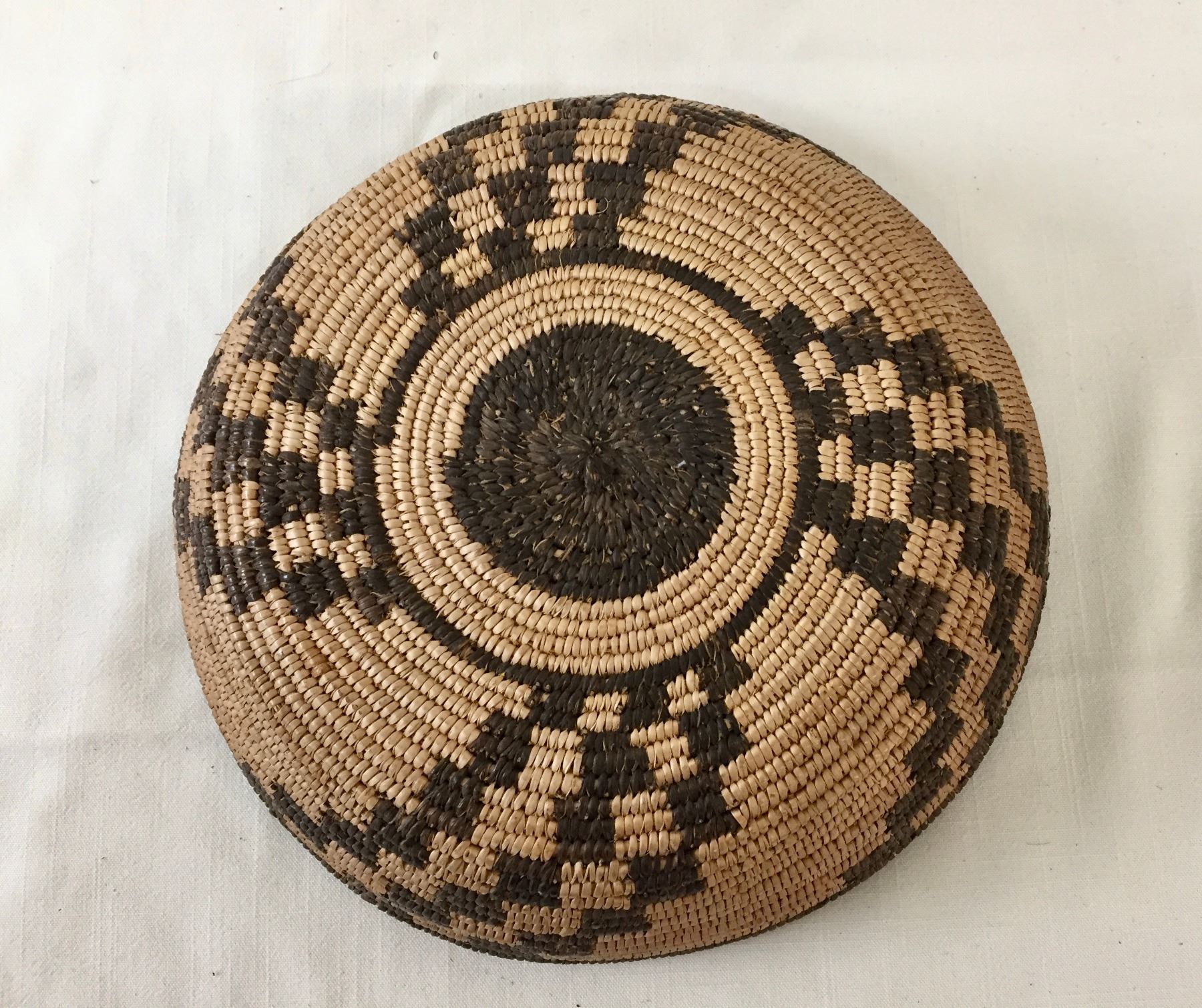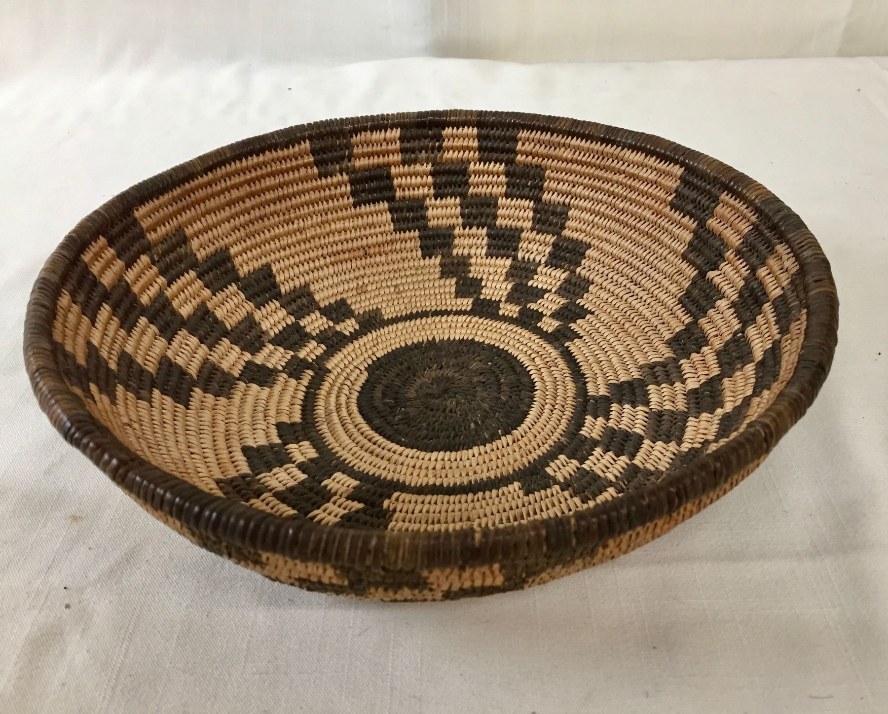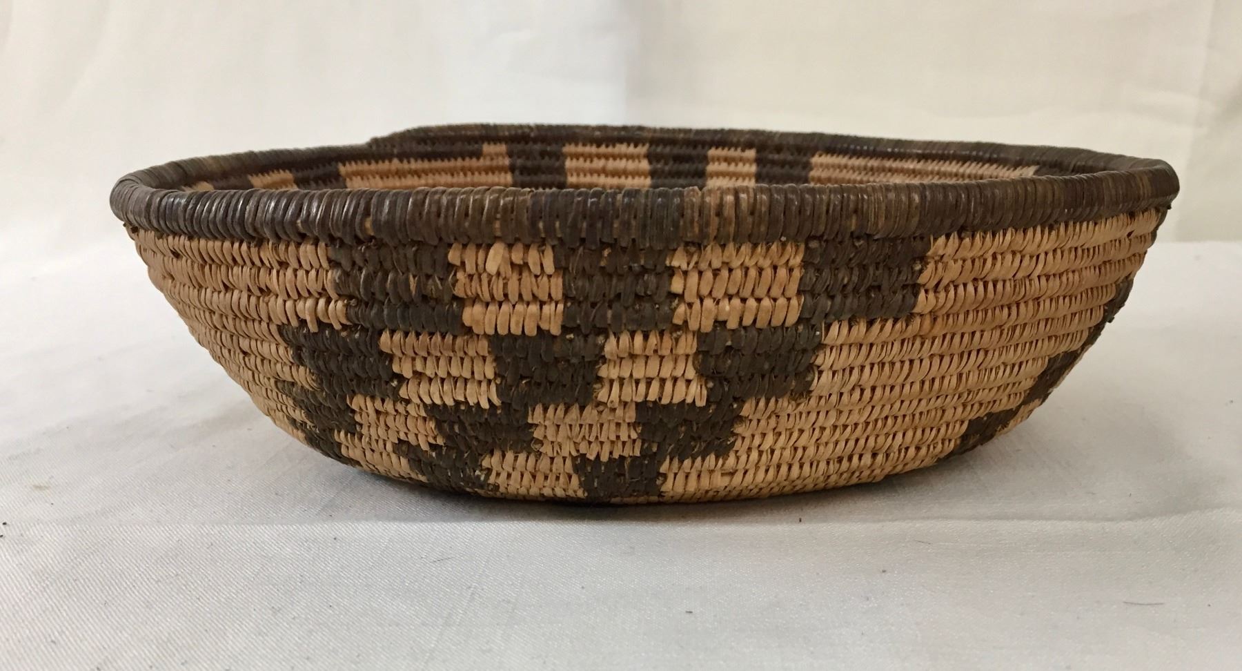 Description: Presented for sale in this lot is a beautiful, antique, tightly woven Apache basket featuring geometrical designs. Made with willow and devils claw on a willow rod foundation. Maker: Unknown Apache weaver.