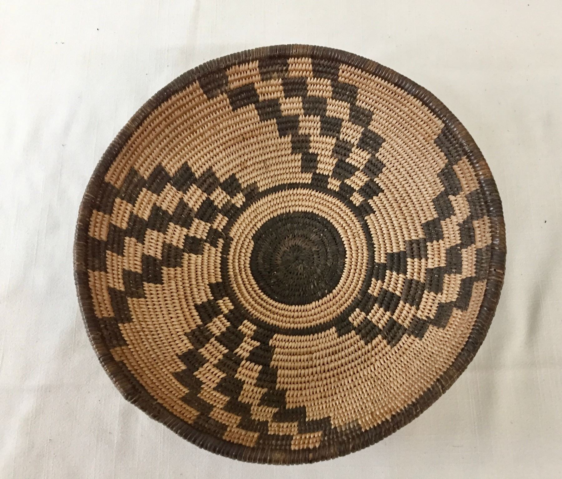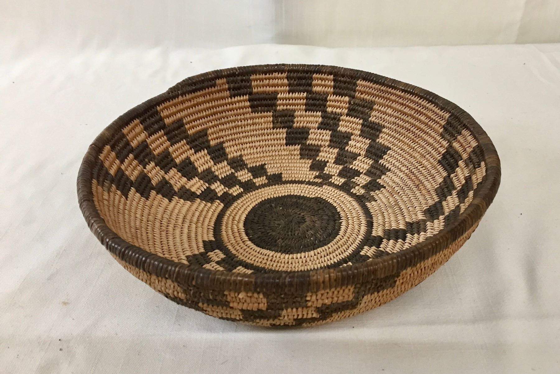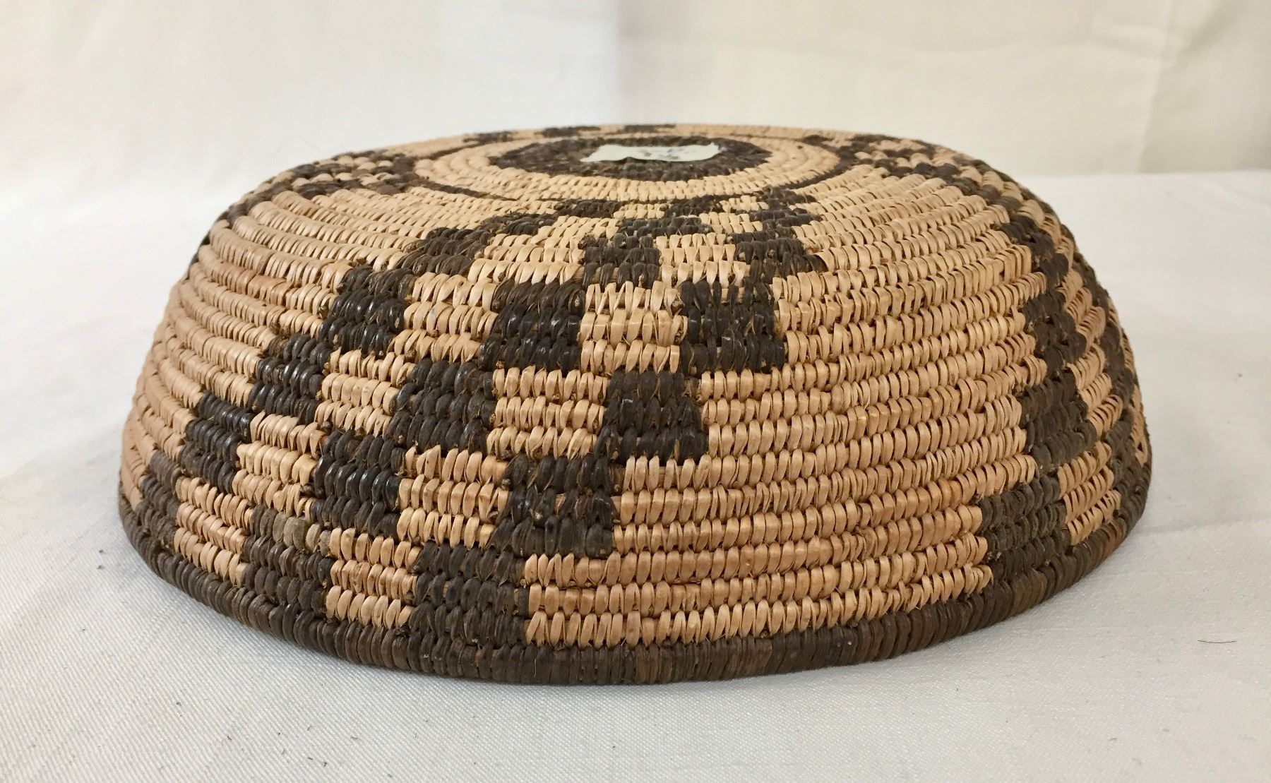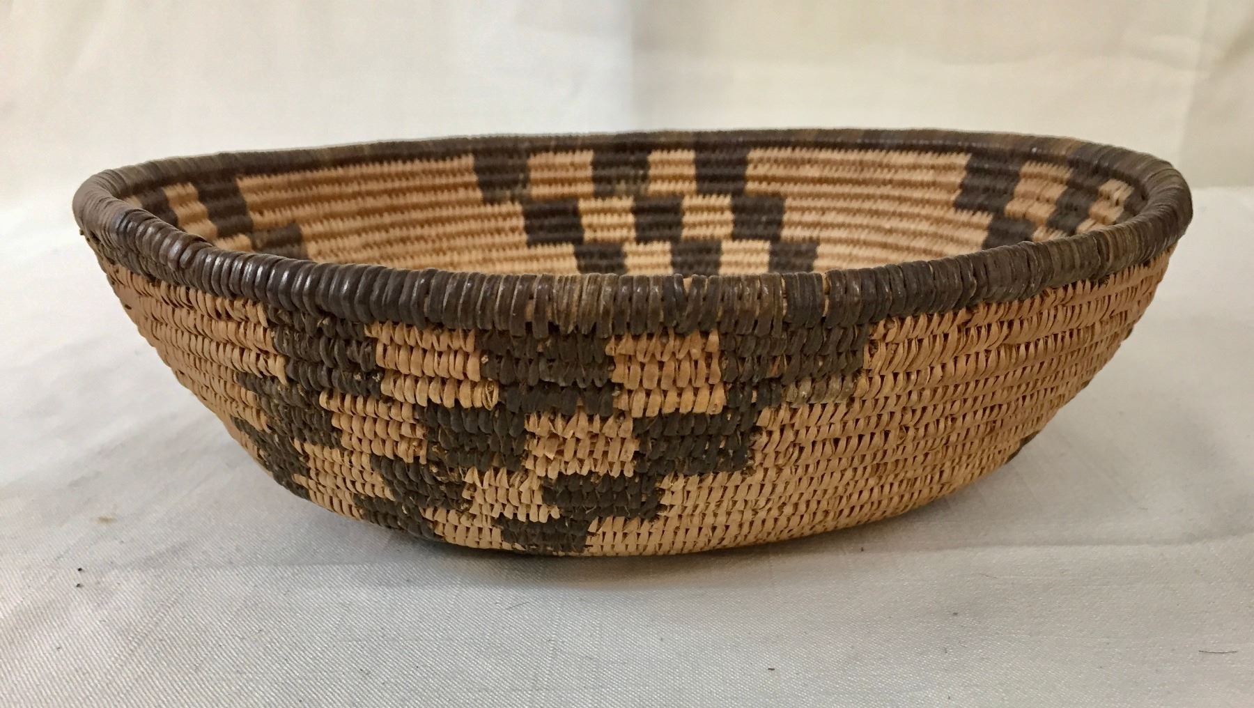 Description: Presented for sale in this lot is a beautiful, antique, tightly woven Apache basket featuring geometrical designs. Made with willow and devils claw on a willow rod foundation. Maker: Unknown Apache weaver.