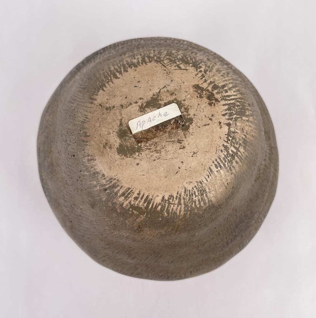 Gray Ware. Nice old vessel with museum or collection tag on bottom. Lower half has decoration as shown. Just under 8" diameter, and just under 6" tall. Allard Auction Collection Inv: SIJ 26449