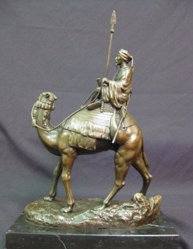 Antique Arab (Muslim) Warrior Sculpture......A stunning bronze sculpture of a bedouin warrior with spear and rifle riding his ship of the desert;Height 15.0 x Width 9.4 x Depth 6.7 inches Weight 14.3 lbs.