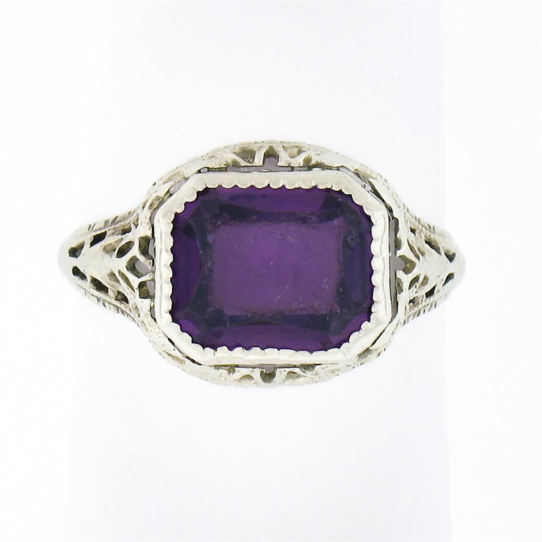 An antique art deco solid 10k white gold solitaire ring, with 1 custom cut natural amethyst (7.4x5.7mm). The ring is size 3.0, weighs a total of 1.18 grams, and measures 9.1mm wide.