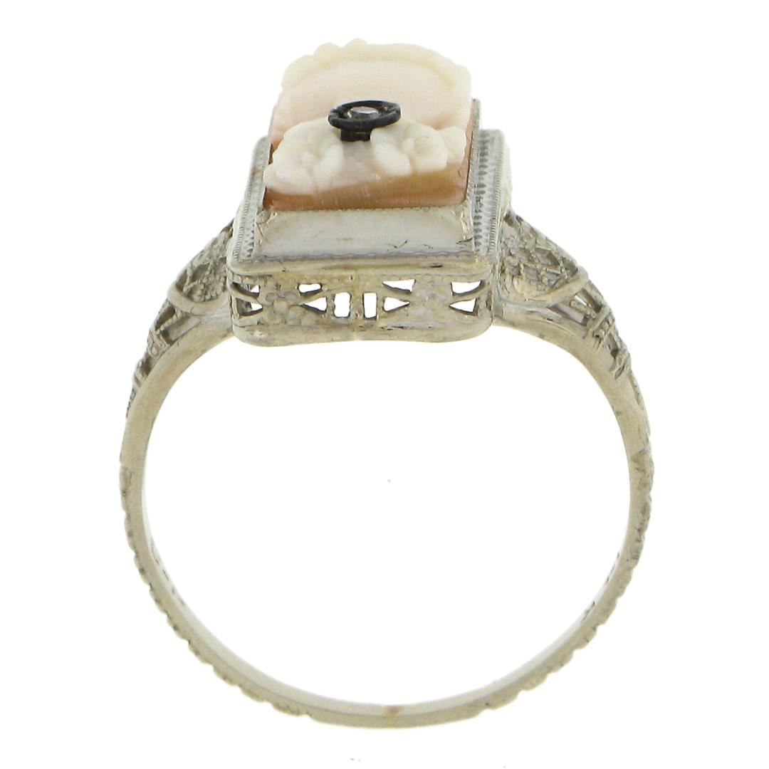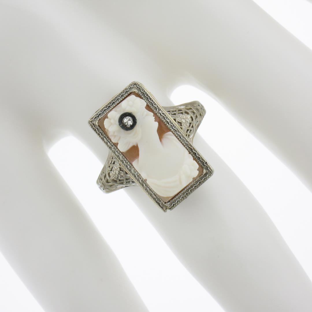An antique solid 14k white gold ring, with 1 carved shell cameo (15.5x7.6mm) & 1 old round cut natural diamond. The ring is size 6.0, weighs a total of 2.82 grams, and measures 17.3mm wide.