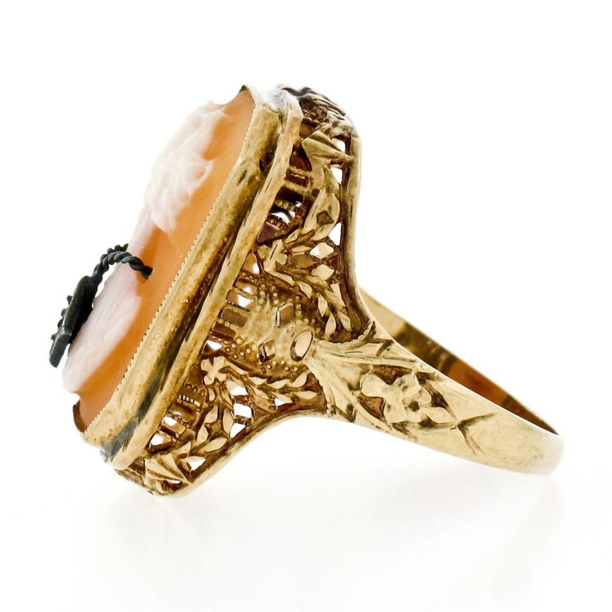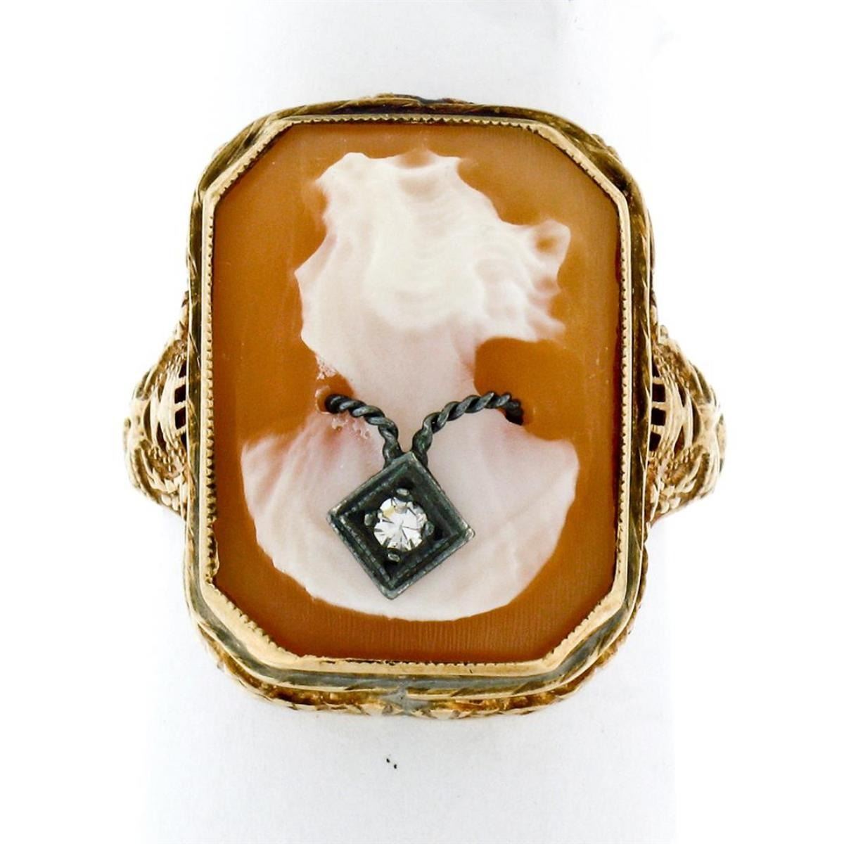 Antique Art Deco 14K Yellow Gold Carved Shell Cameo Diamond Open Filigree Ring. A solid 14k yellow gold art deco period ring featuring a rectangular carved natural shell cameo (16.0x11.5mm) and a round single cut natural diamond (G - SI1; 0.01ct). The ring is size 4.5, weighs a total of 3.33 grams, and measures 18.50mm wide.