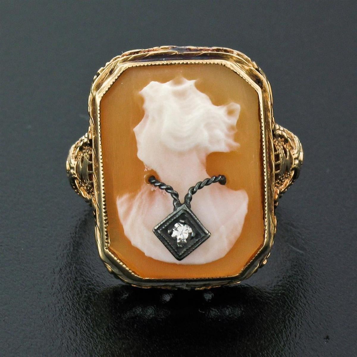 Antique Art Deco 14K Yellow Gold Carved Shell Cameo Diamond Open Filigree Ring. A solid 14k yellow gold art deco period ring featuring a rectangular carved natural shell cameo (16.0x11.5mm) and a round single cut natural diamond (G - SI1; 0.01ct). The ring is size 4.5, weighs a total of 3.33 grams, and measures 18.50mm wide.