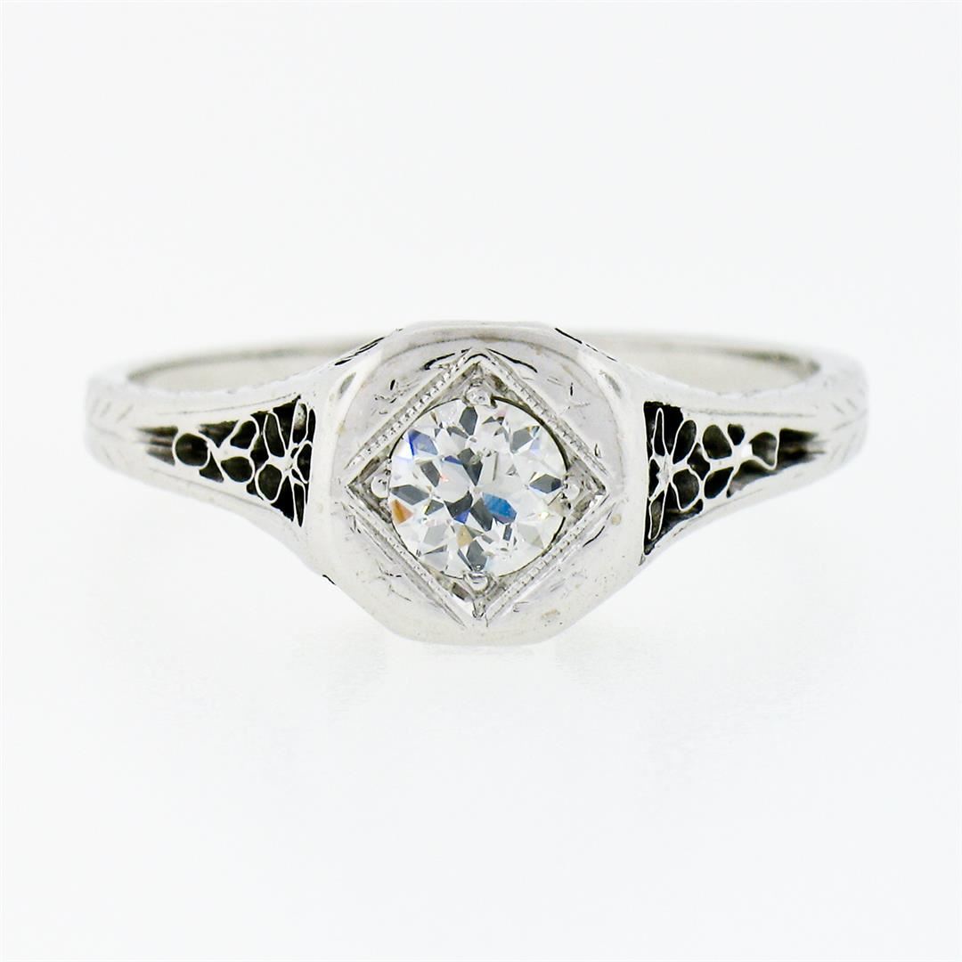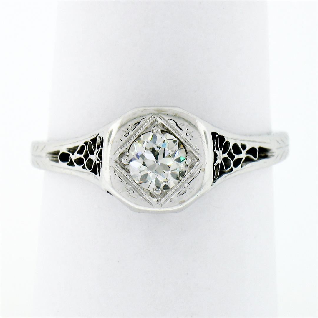 An antique soldi 14k white gold solitaire ring, with 1 old european cut natural diamond (I/J- VS2 ; 0.36ct ). The ring is size 7.5, weighs a total of 2.61 grams, and measures 7.90mm wide.