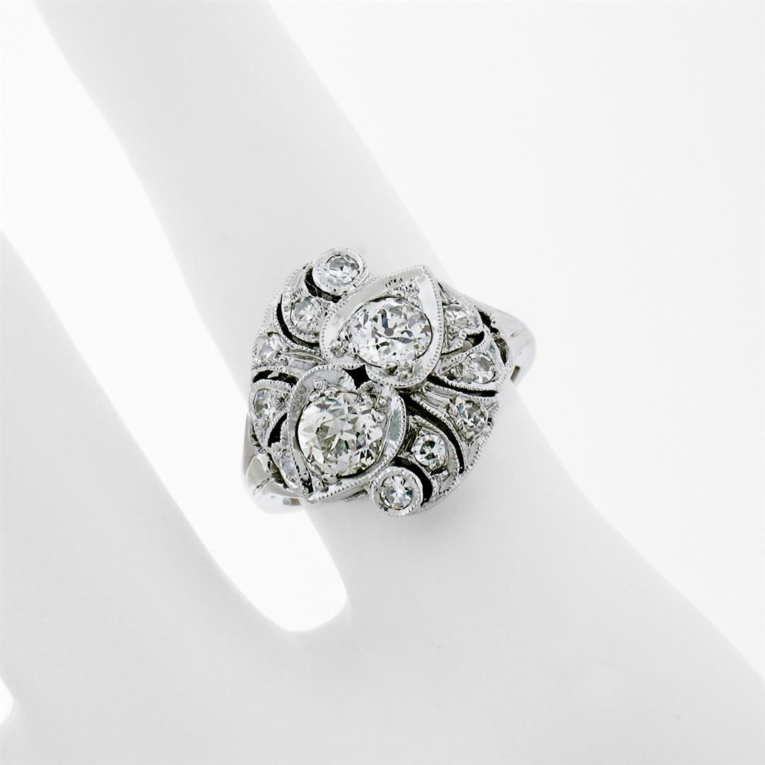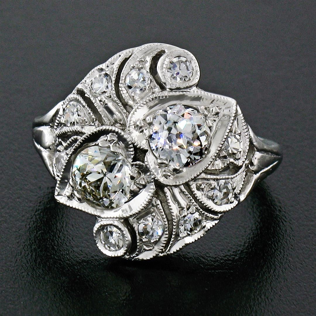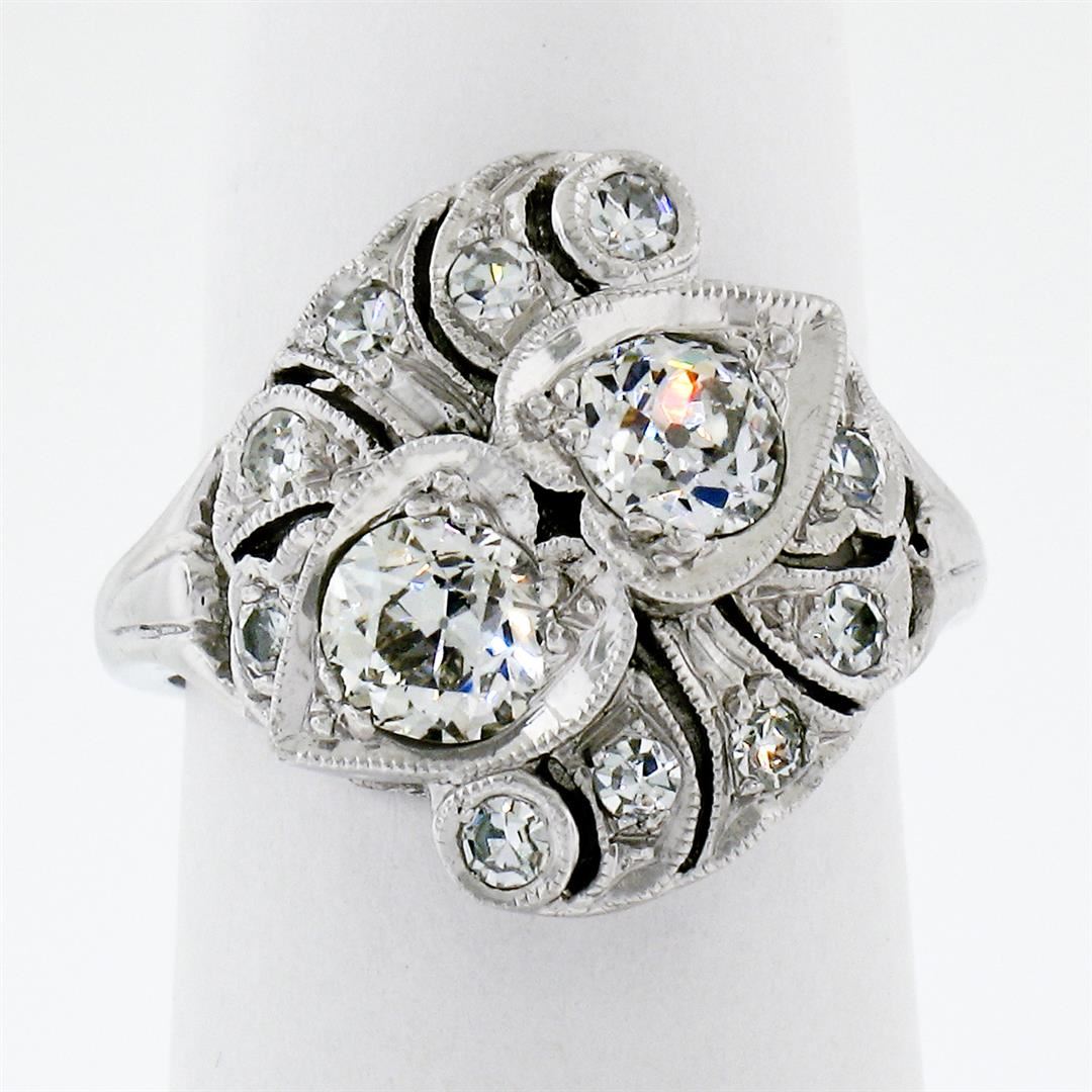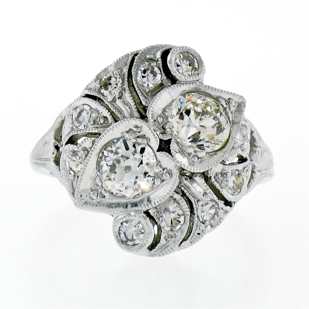 An antique solid 14k white gold bypass heart dinner ring, featuring 2 old european cut natural diamonds (I/J- VS1/VS2; 0.84ctw), and 10 singke cut natural diamonds (H/I- VVS2/VS1; 0.25ctw). The ring is size 4.0, weighs a total of 3.65 grams, and measures15.65mm wide.