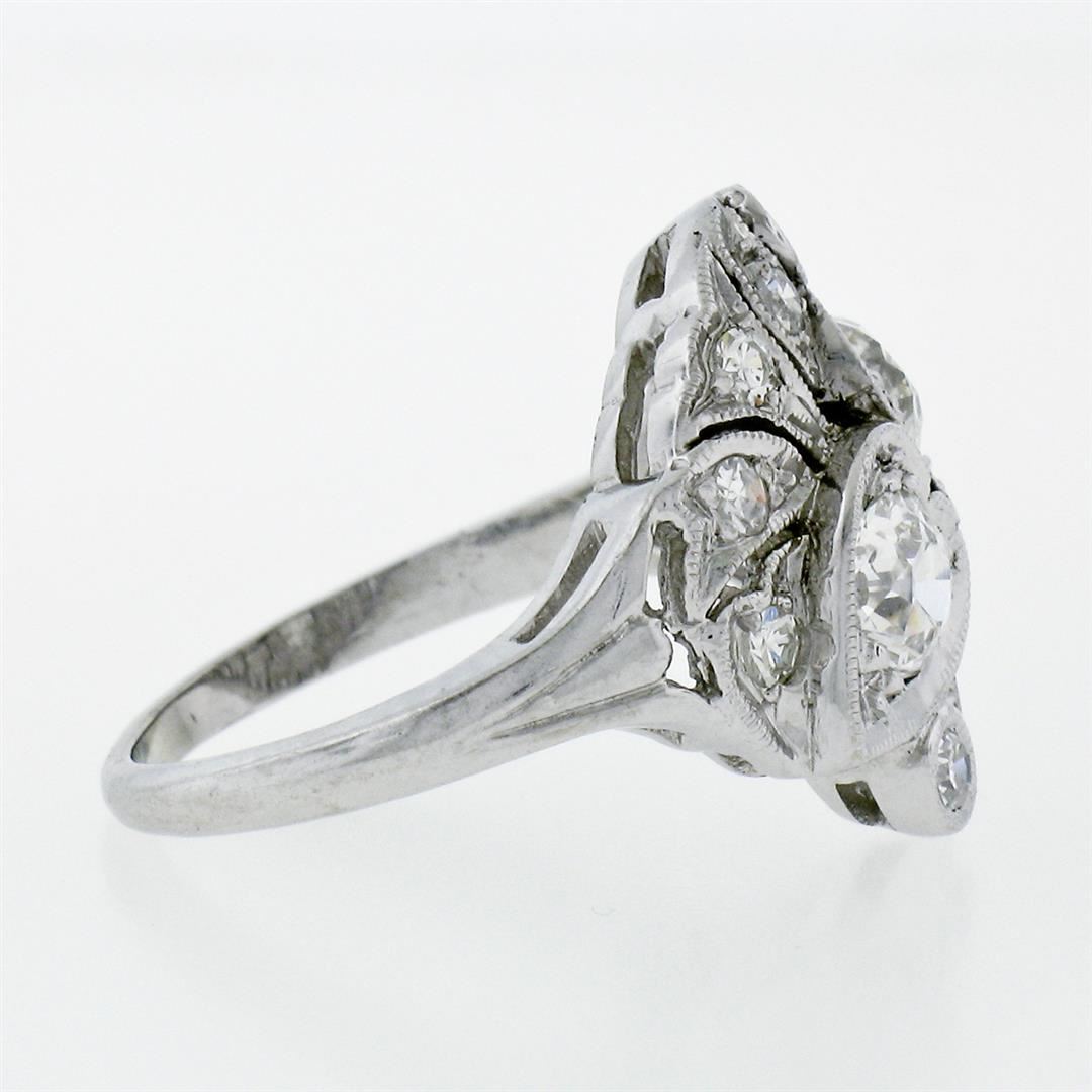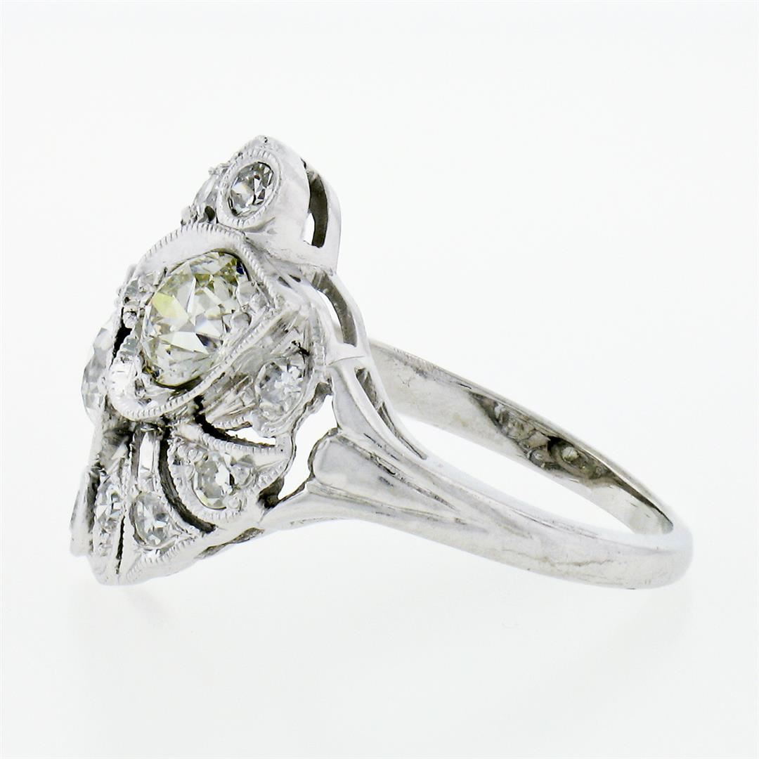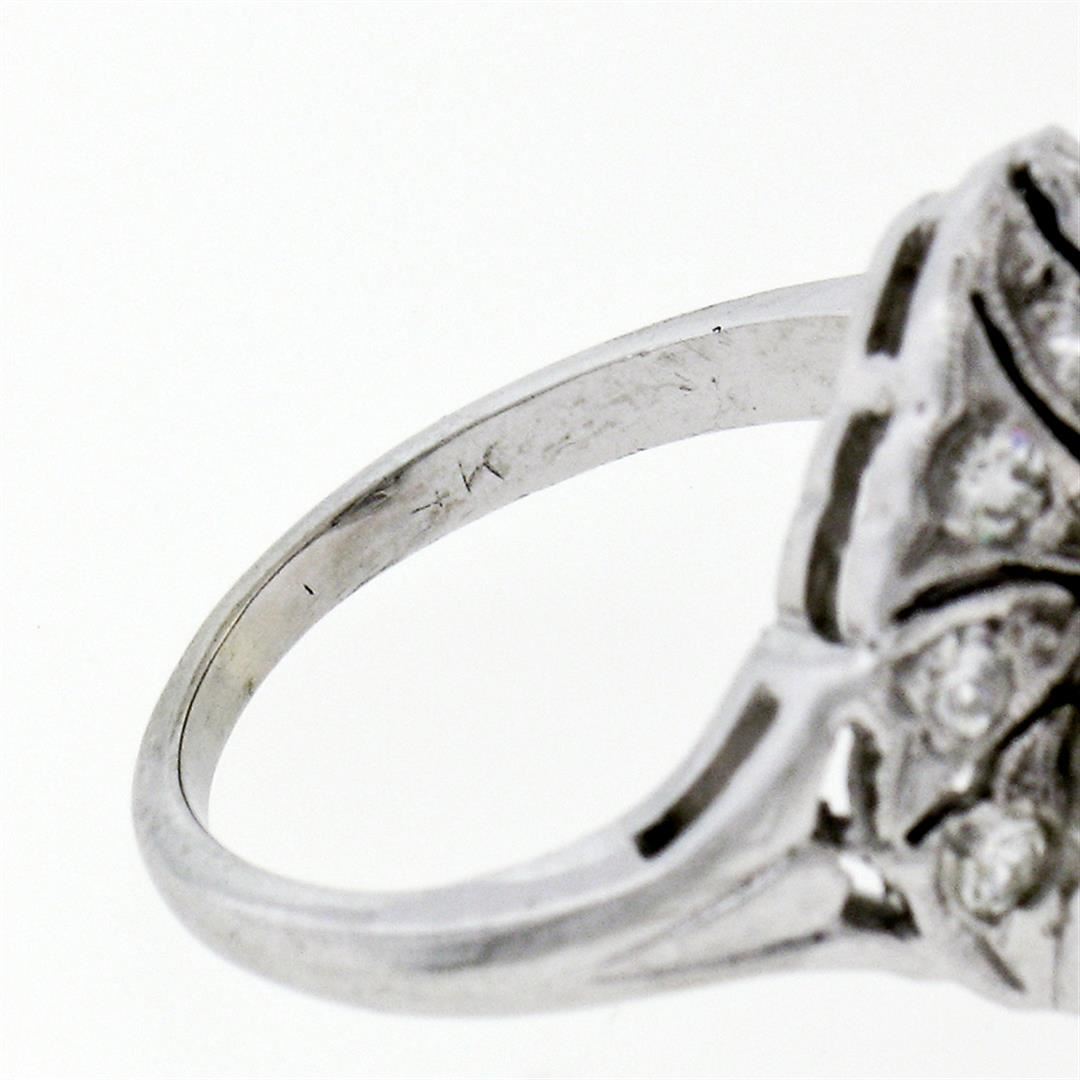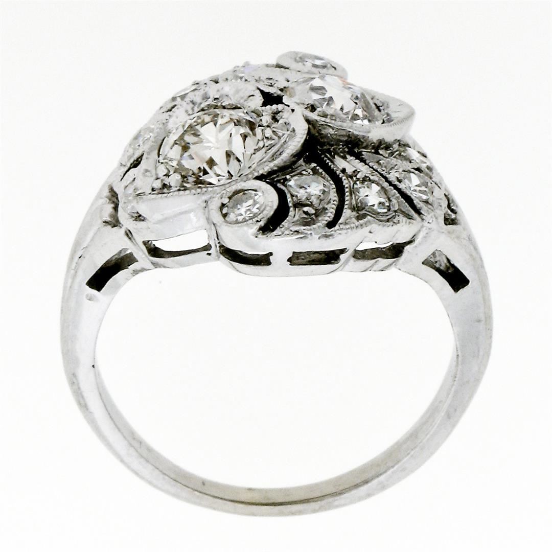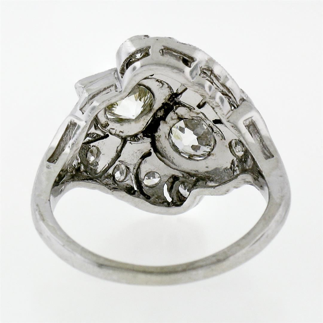 An antique solid 14k white gold bypass heart dinner ring, featuring 2 old european cut natural diamonds (I/J- VS1/VS2; 0.84ctw), and 10 singke cut natural diamonds (H/I- VVS2/VS1; 0.25ctw). The ring is size 4.0, weighs a total of 3.65 grams, and measures15.65mm wide.