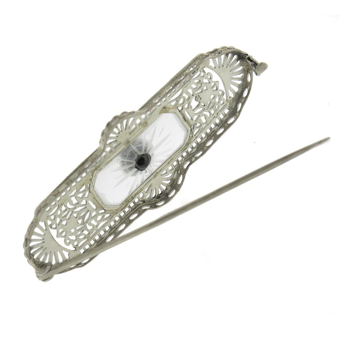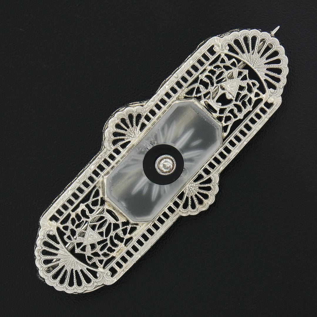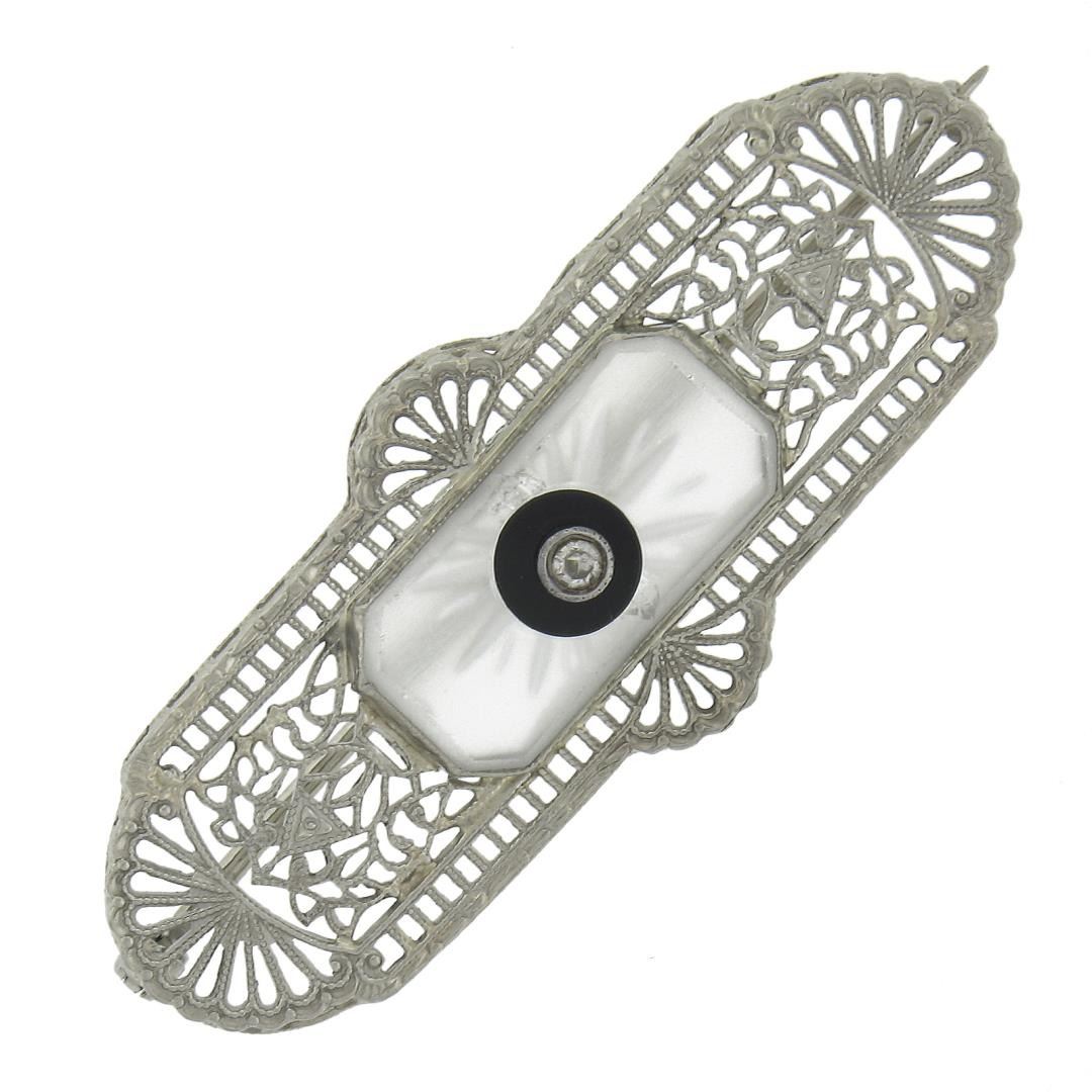 Antique Art Deco 14k Gold Camphor Glass w/ Diamond & Onyx Filigree Pin Brooch