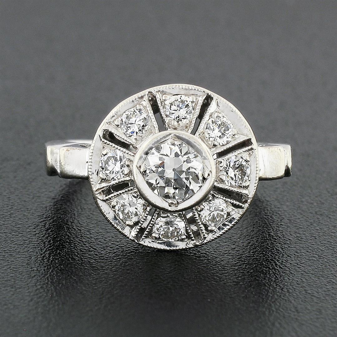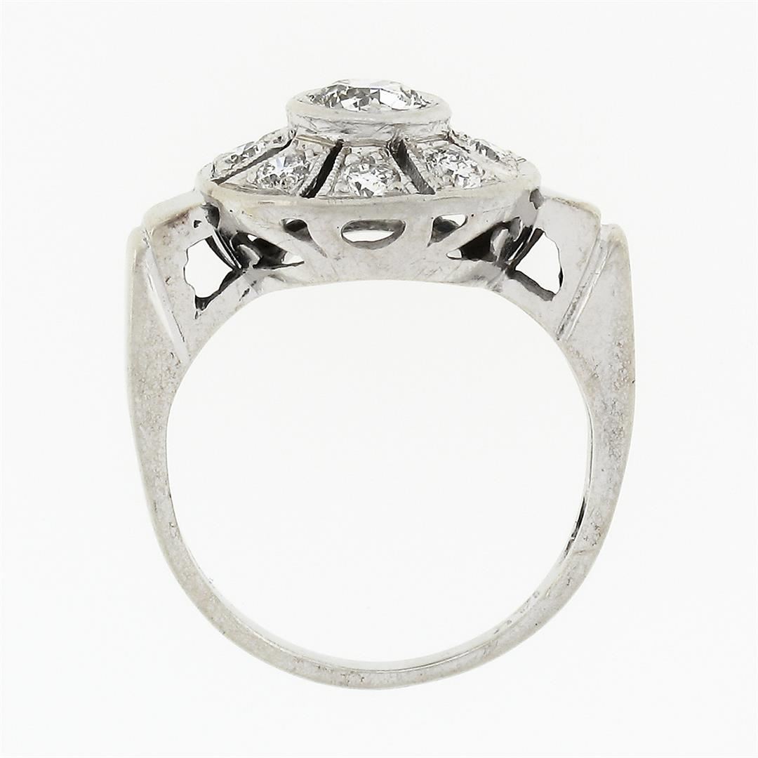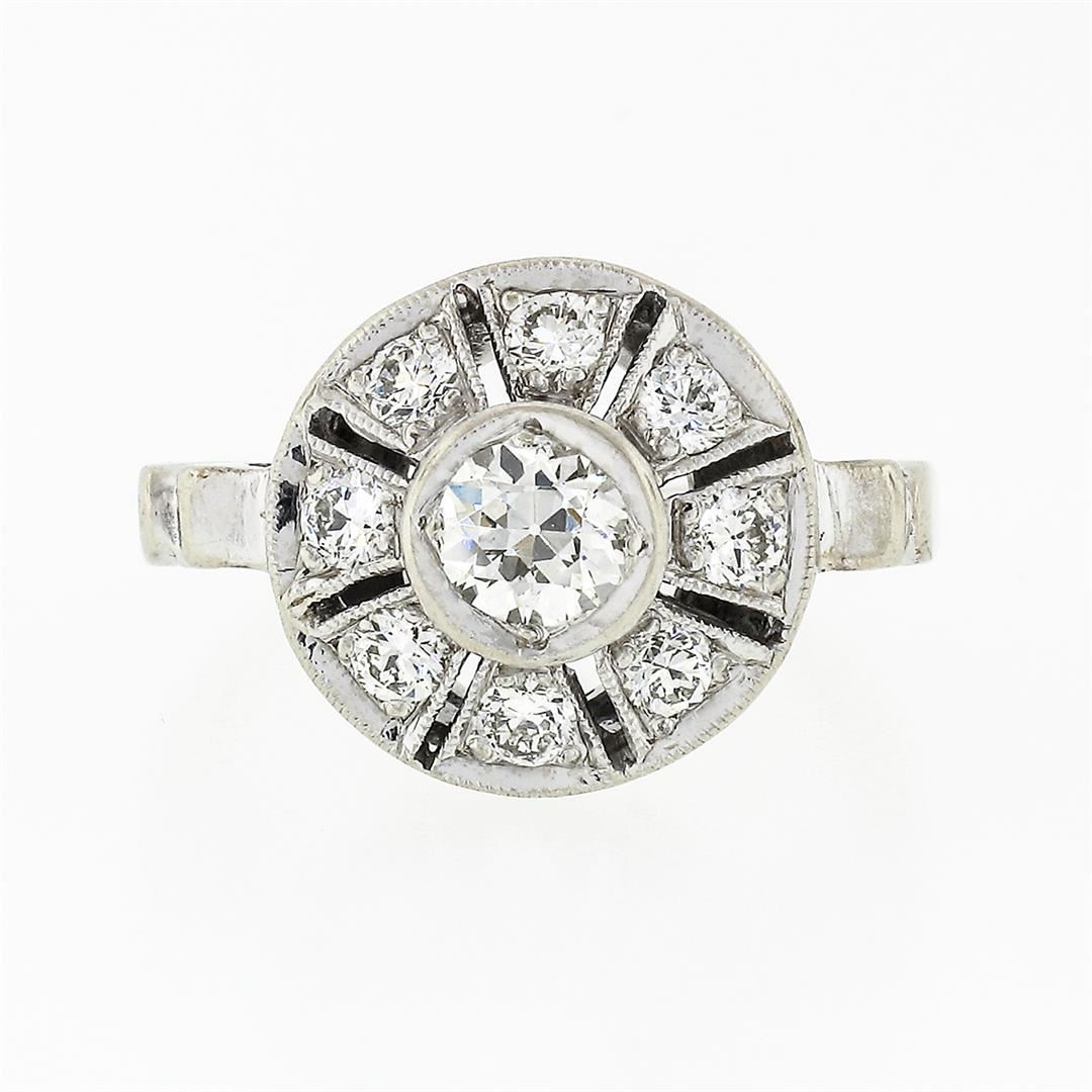 An antique art deco solid 14k white gold platter ring, with 9 old european cut natural diamonds (G/H - VS1/VS2; 0.70ctw). The ring is size 4, weighs a total of 3,03 grams, and measures 11.8mm wide.