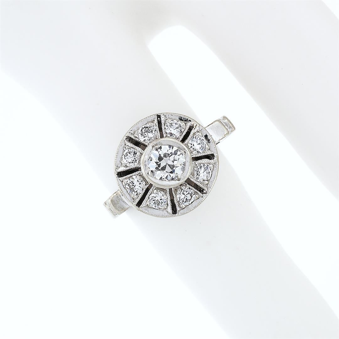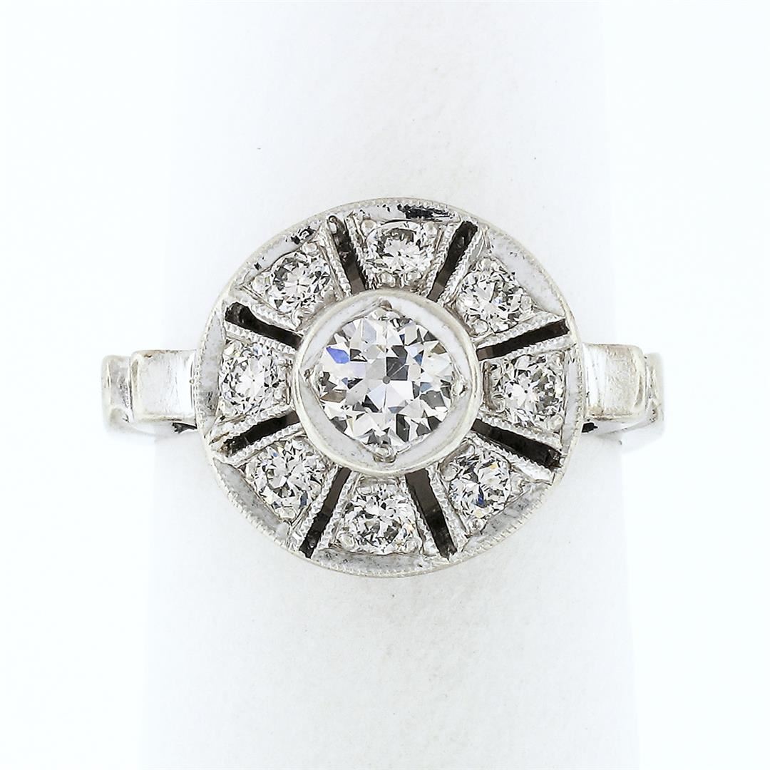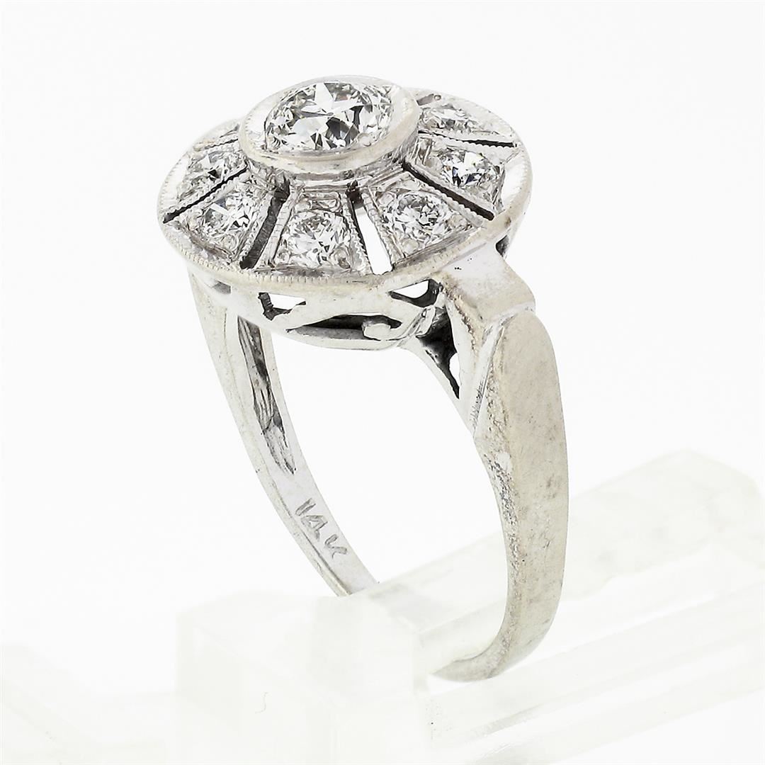 An antique art deco solid 14k white gold platter ring, with 9 old european cut natural diamonds (G/H - VS1/VS2; 0.70ctw). The ring is size 4, weighs a total of 3,03 grams, and measures 11.8mm wide.