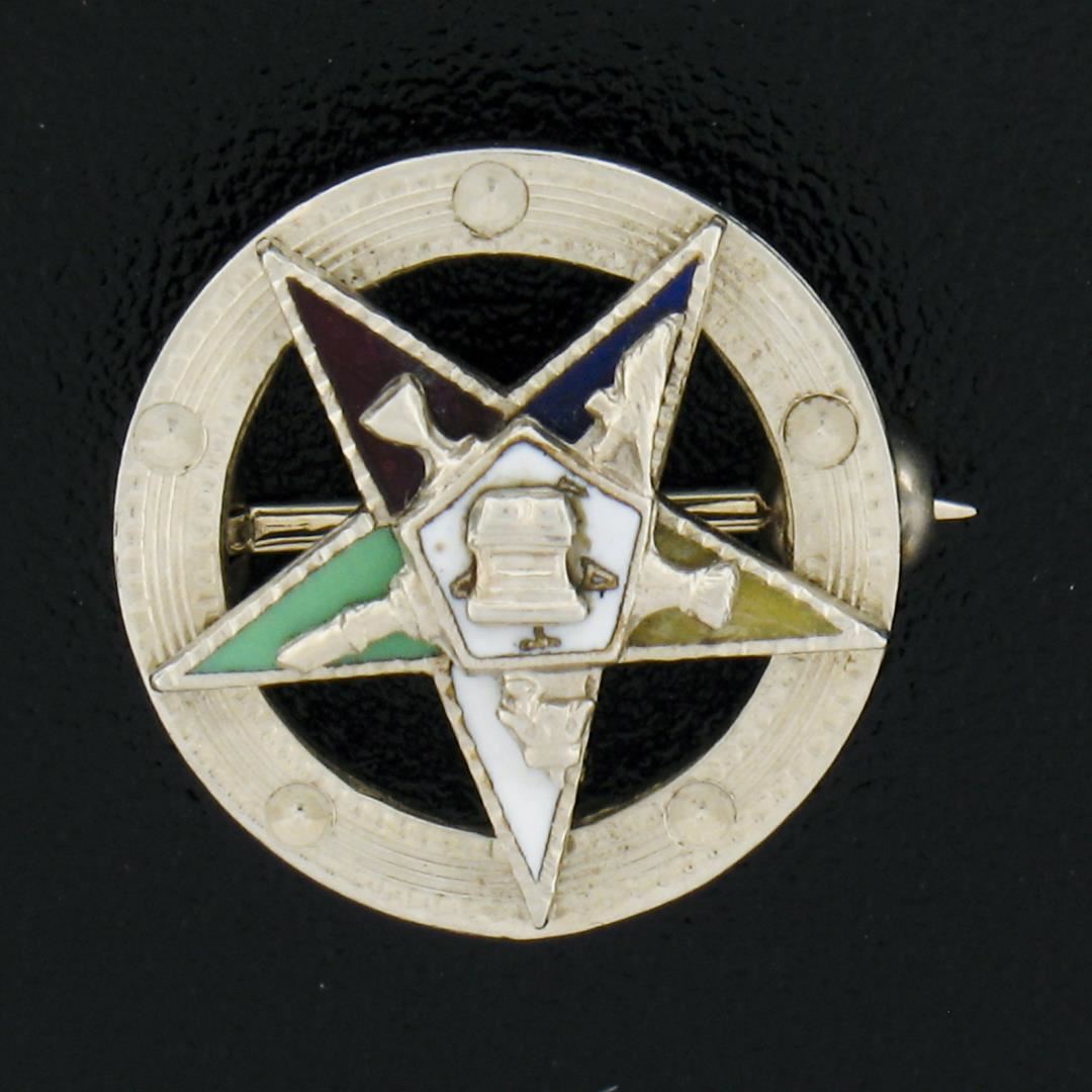 An antique solid 14k white gold masonic brooch, with multi colors enamel work. Measures 11.8mm in diameter and weighs a total of 1.42 grams.