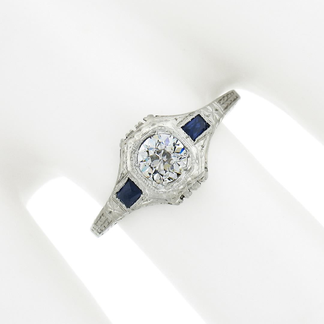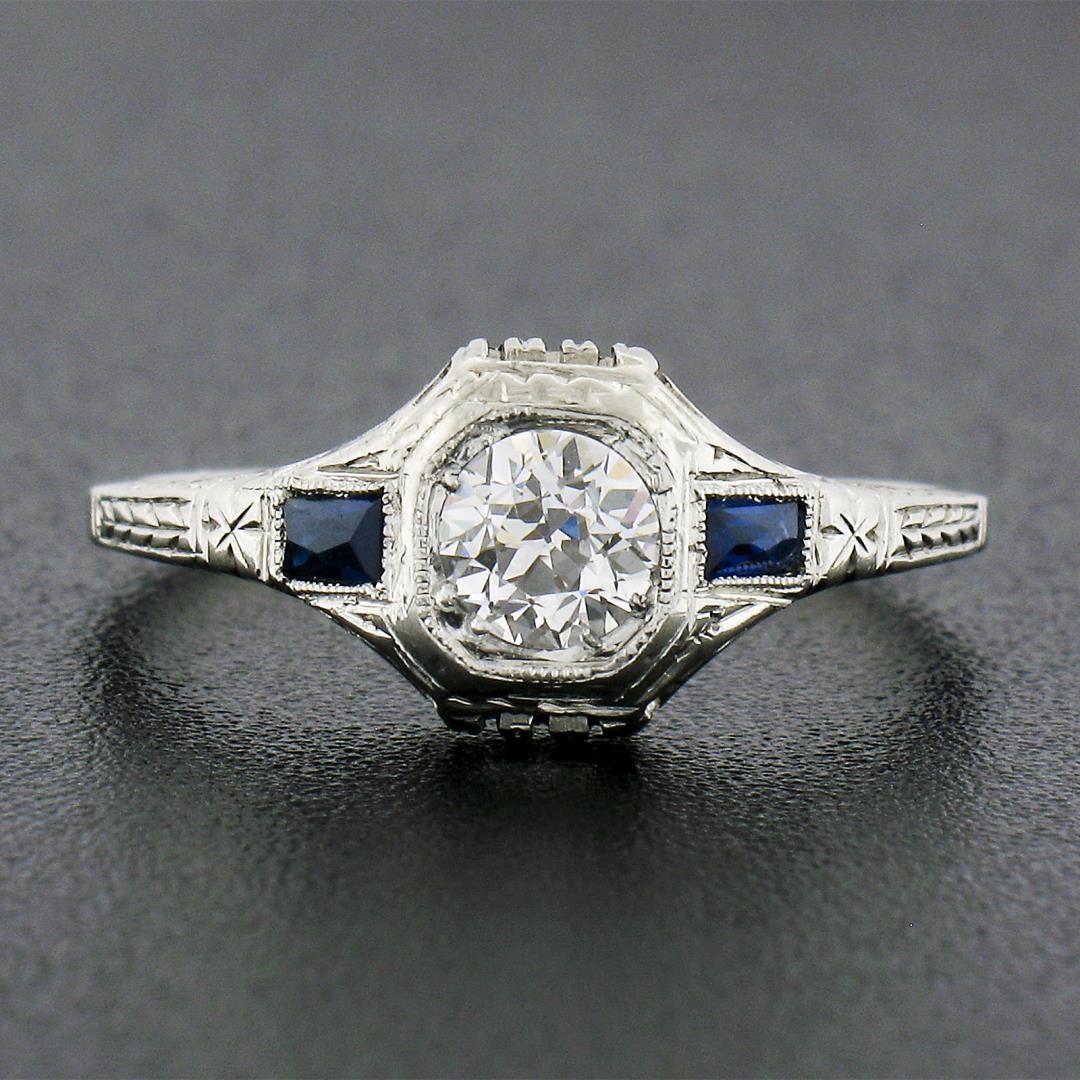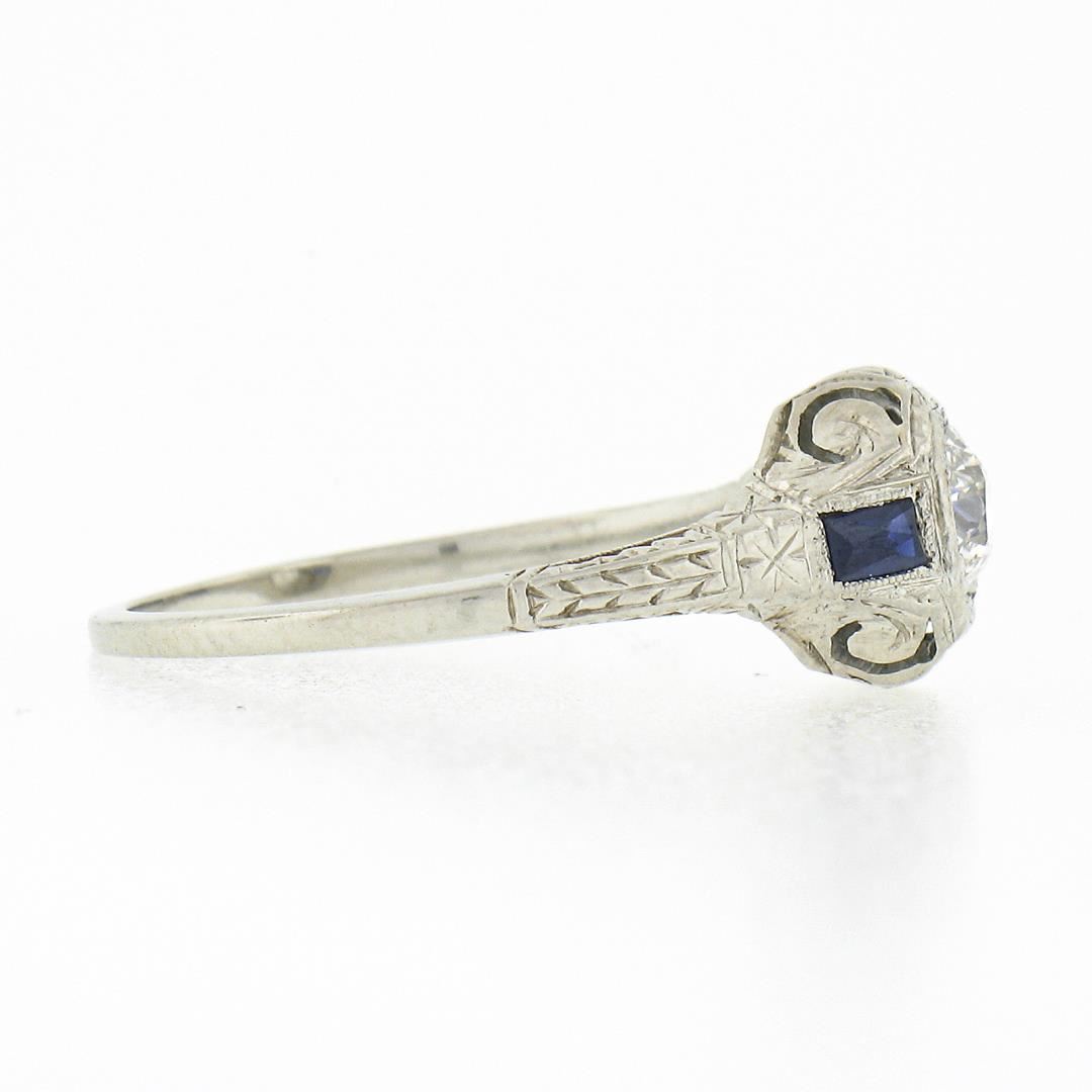 An antique art deco solid 18k white gold ring, with 1 old european cut natural diamond (G - VS2 ; 0.37ct), and 2 french baguette cut synthetic sapphires (3.3x1.9mm each). The ring is size 6.5, weighs a total of 2.54 grams, and measures 8mm wide.