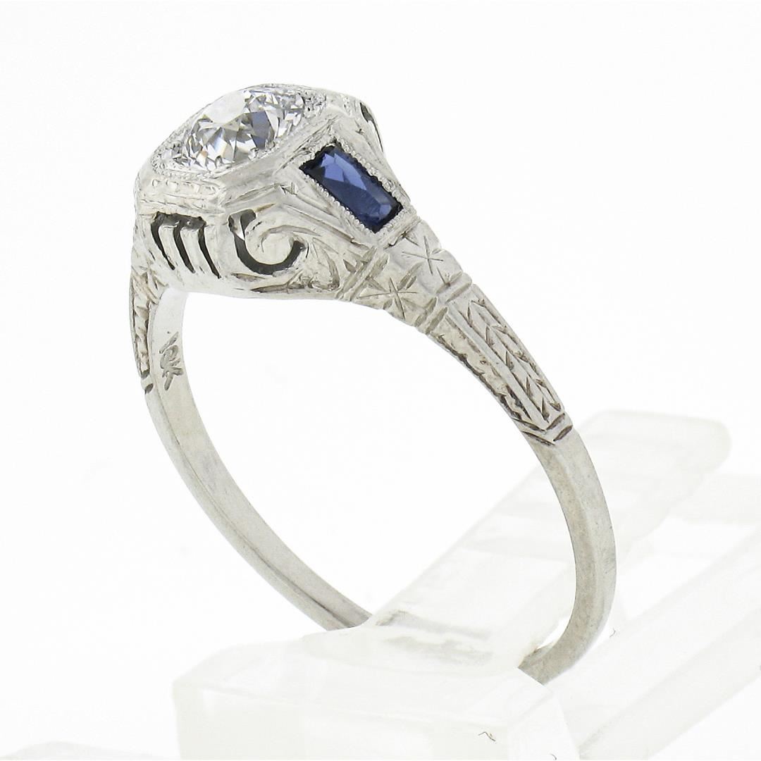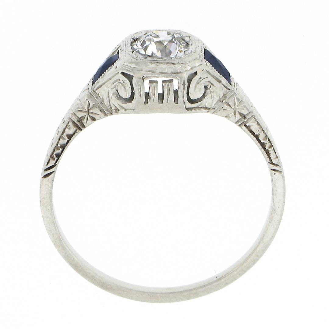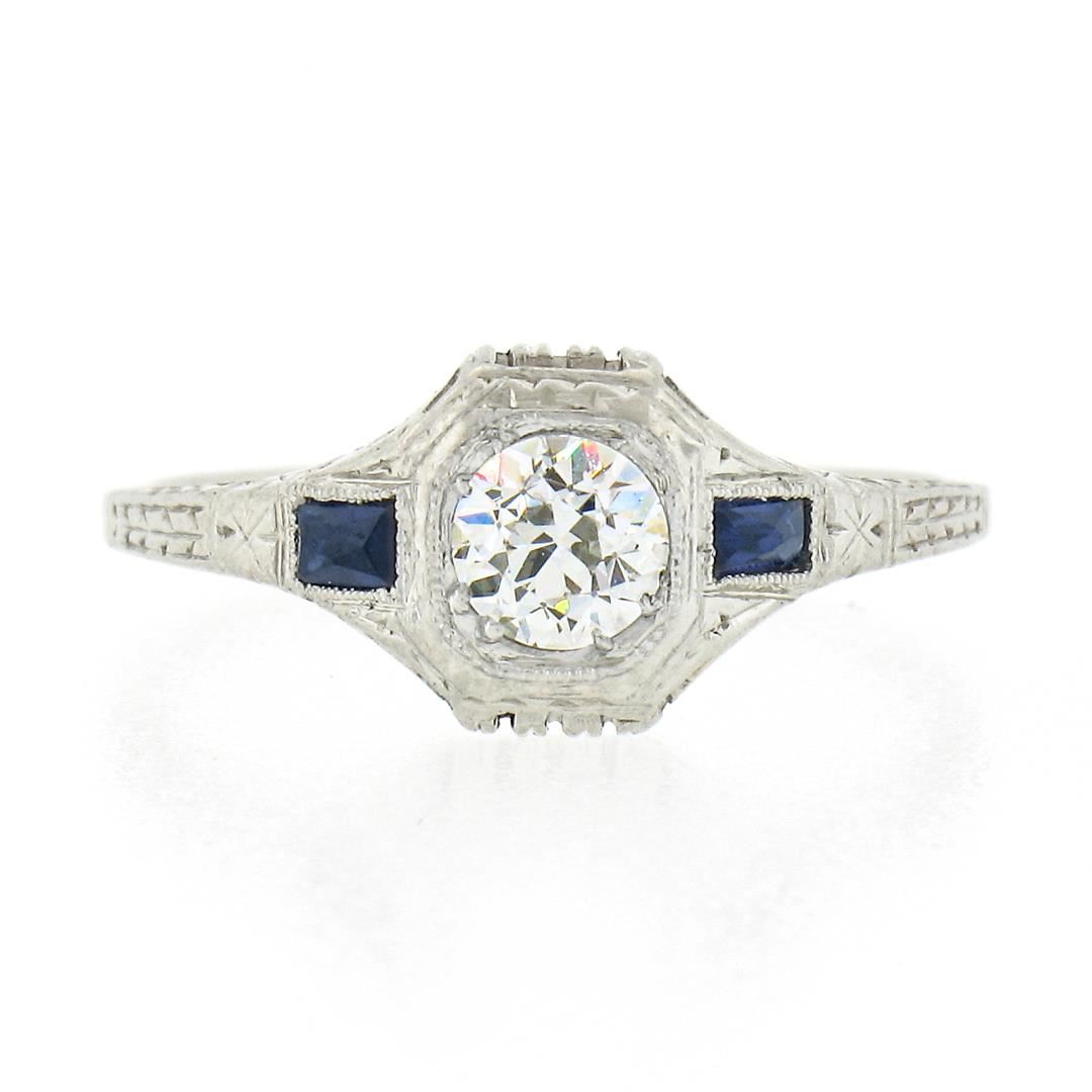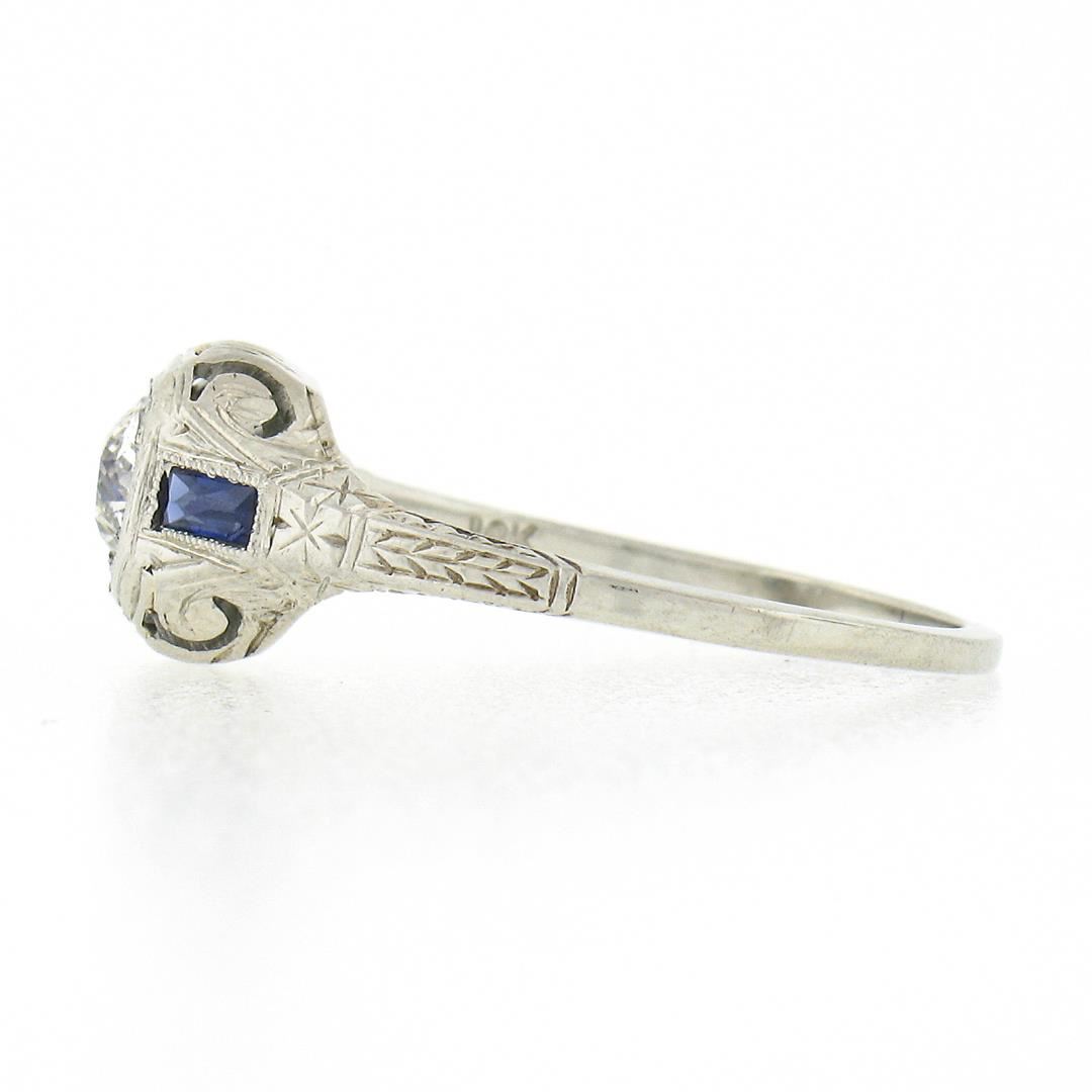 An antique art deco solid 18k white gold ring, with 1 old european cut natural diamond (G - VS2 ; 0.37ct), and 2 french baguette cut synthetic sapphires (3.3x1.9mm each). The ring is size 6.5, weighs a total of 2.54 grams, and measures 8mm wide.