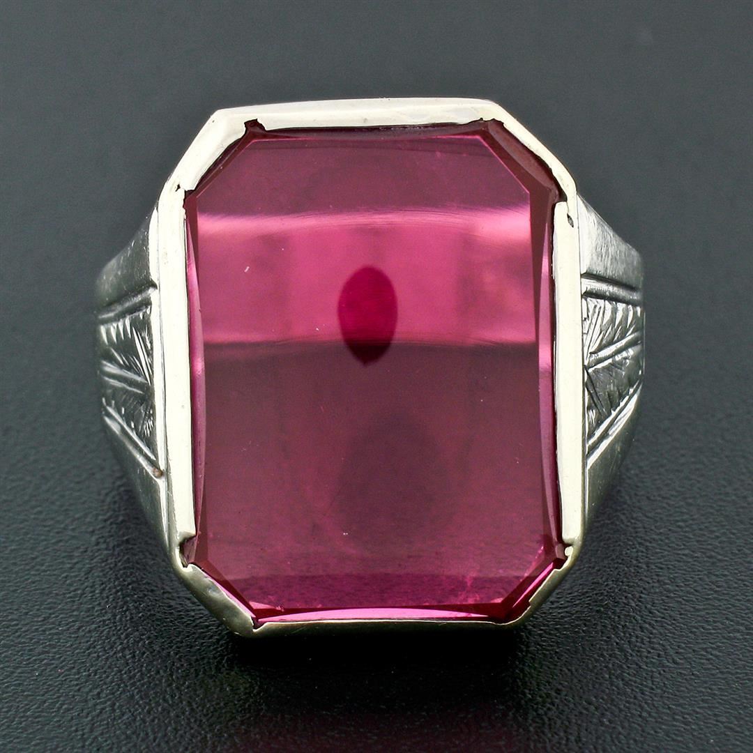 An antique art deco solid 14k white gold mens ring, with 1 rectangular cut synthetic red stone (19.6x14.9mm). The ring is size 11.5, weighs a total of 9.23 grams, and measures 21.04mm wide.