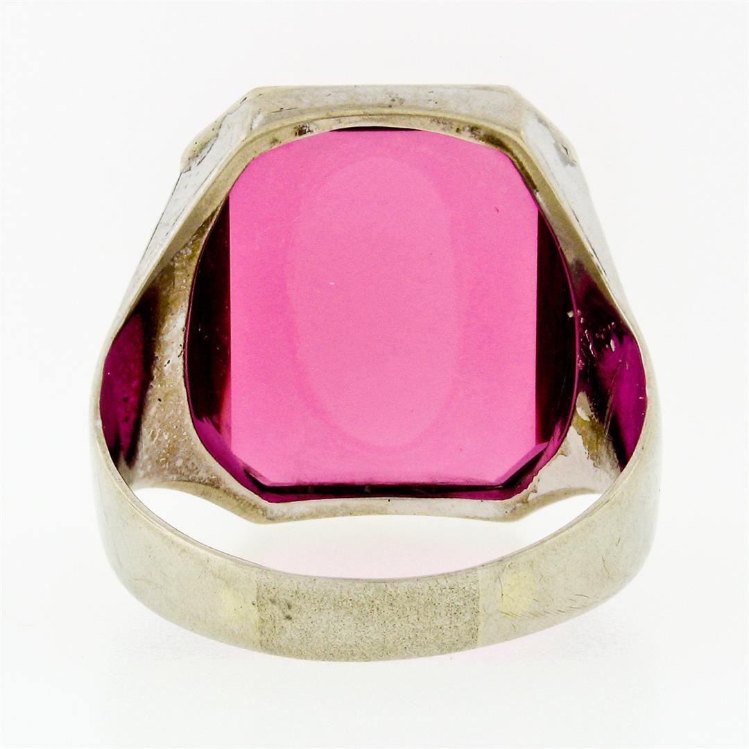 An antique art deco solid 14k white gold mens ring, with 1 rectangular cut synthetic red stone (19.6x14.9mm). The ring is size 11.5, weighs a total of 9.23 grams, and measures 21.04mm wide.
