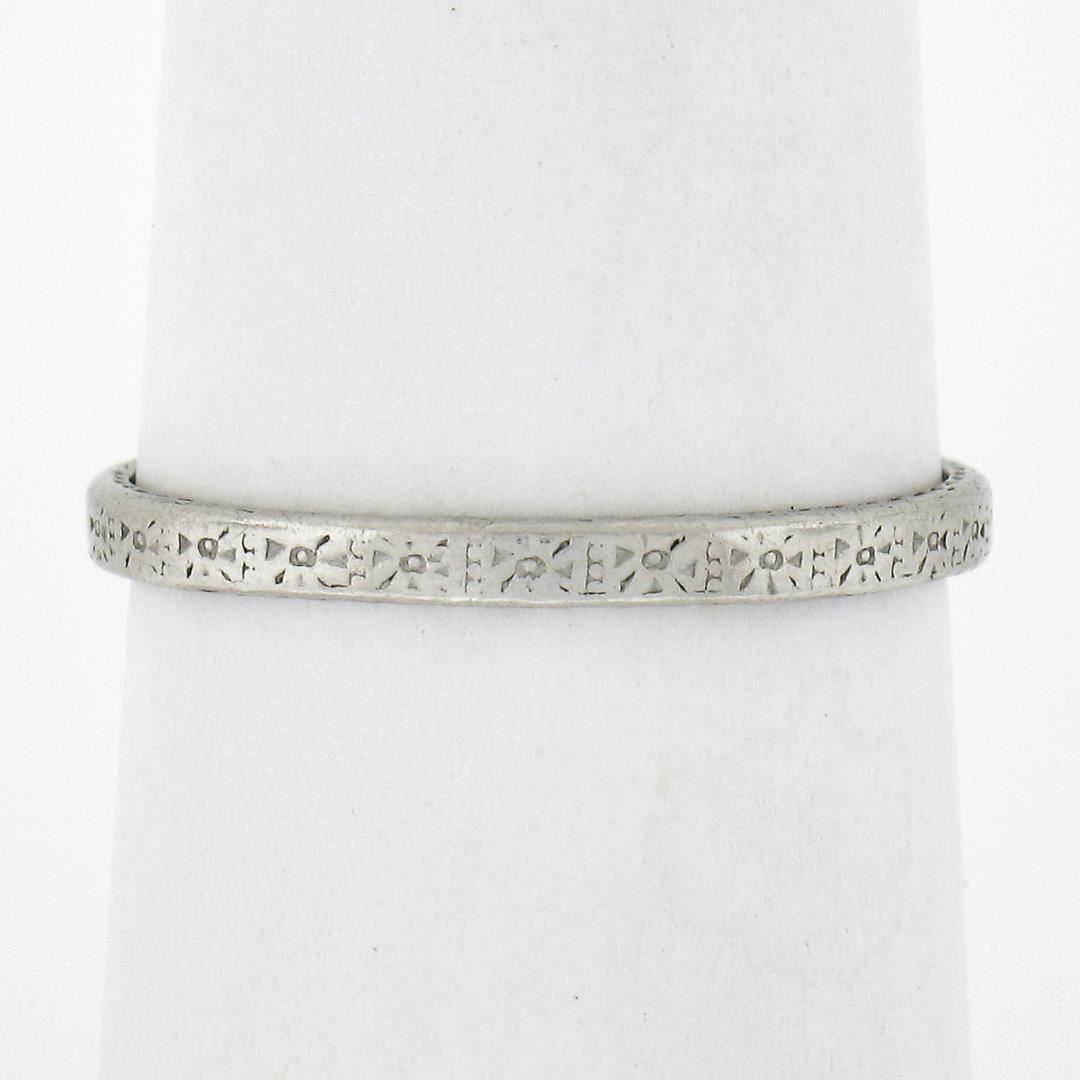 An antique solid platinum band ring.The ring is size 7.0, weighs a total of 1.91 grams, and measures 1.9mm wide.