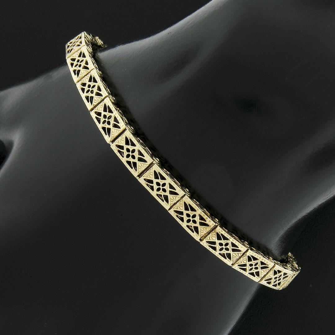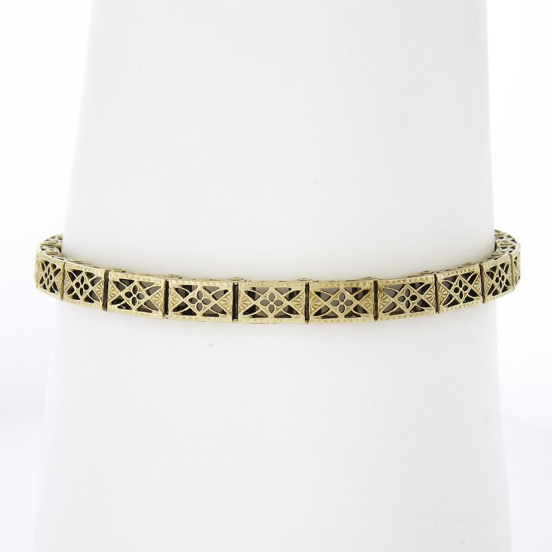 An antique solid 14k yellow gold bracelet. It weighs a total of 10.49 grams, measures 5.2mm wide, and measures 7 inches in length.