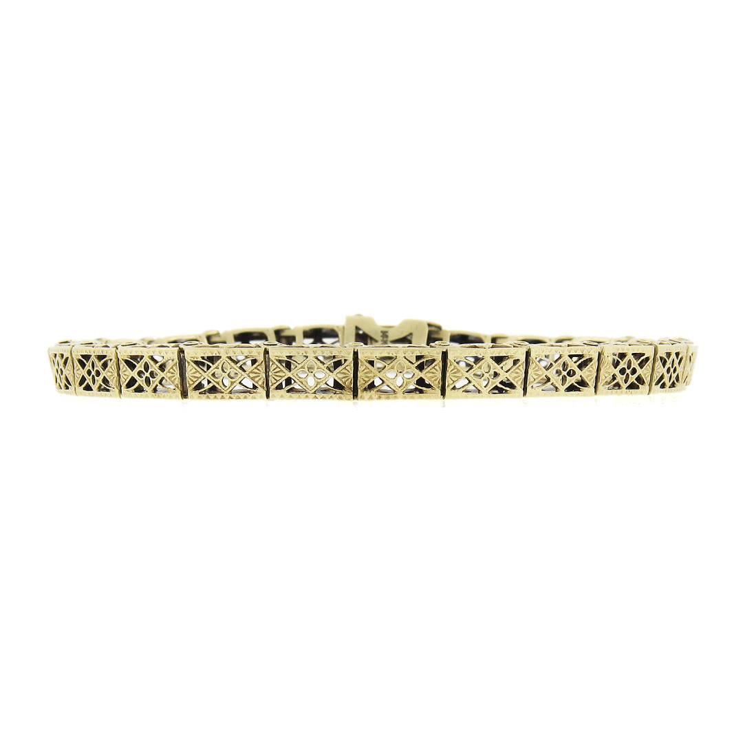 An antique solid 14k yellow gold bracelet. It weighs a total of 10.49 grams, measures 5.2mm wide, and measures 7 inches in length.