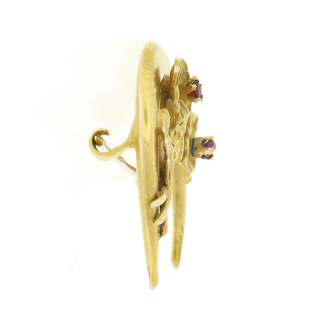 An antique solid 10k yellow gold crescent pin brooch, with 2 round brilliant cut natural rubies (0.04ctw). Measures 20.65x22.70mm and weighs a total of 1.76 grams.