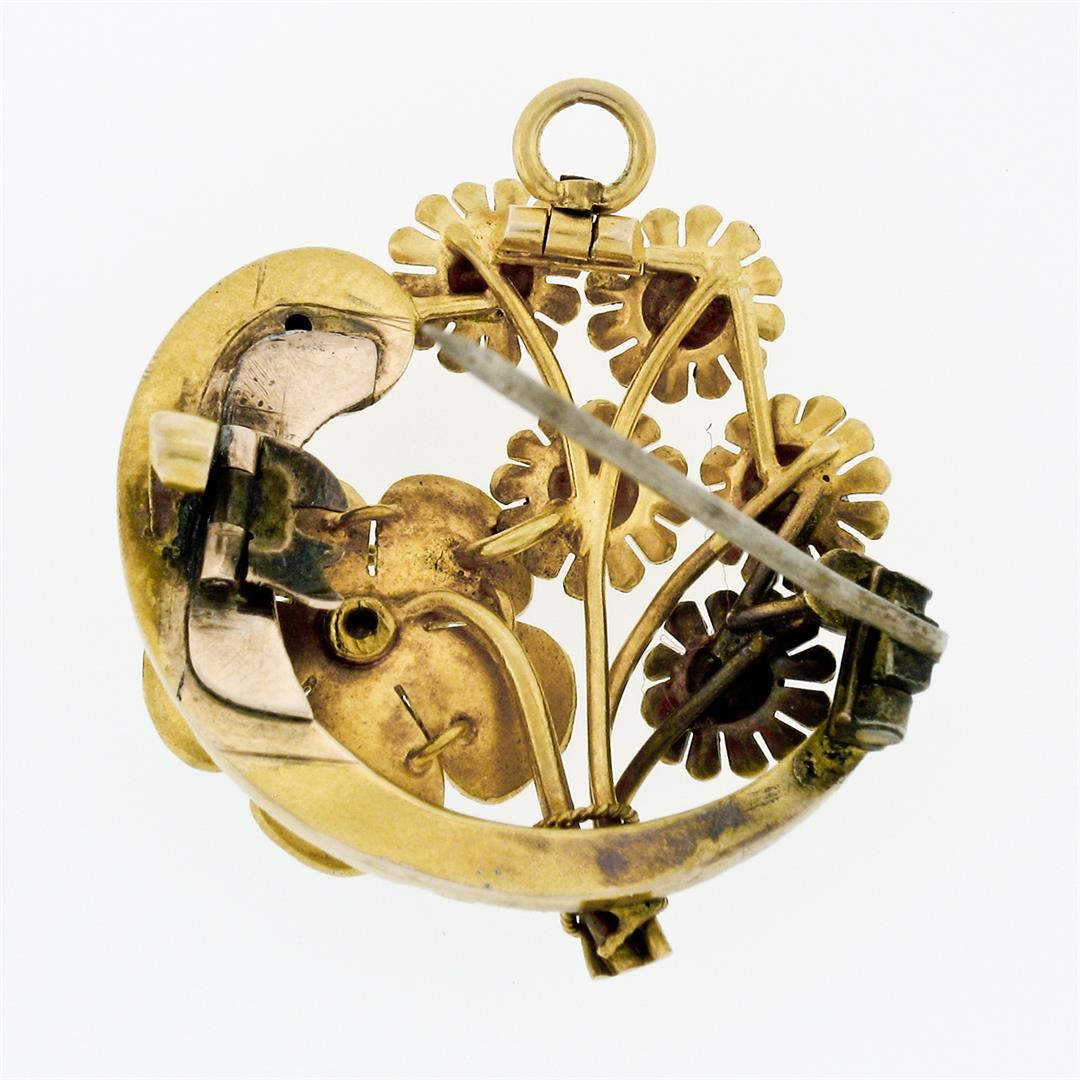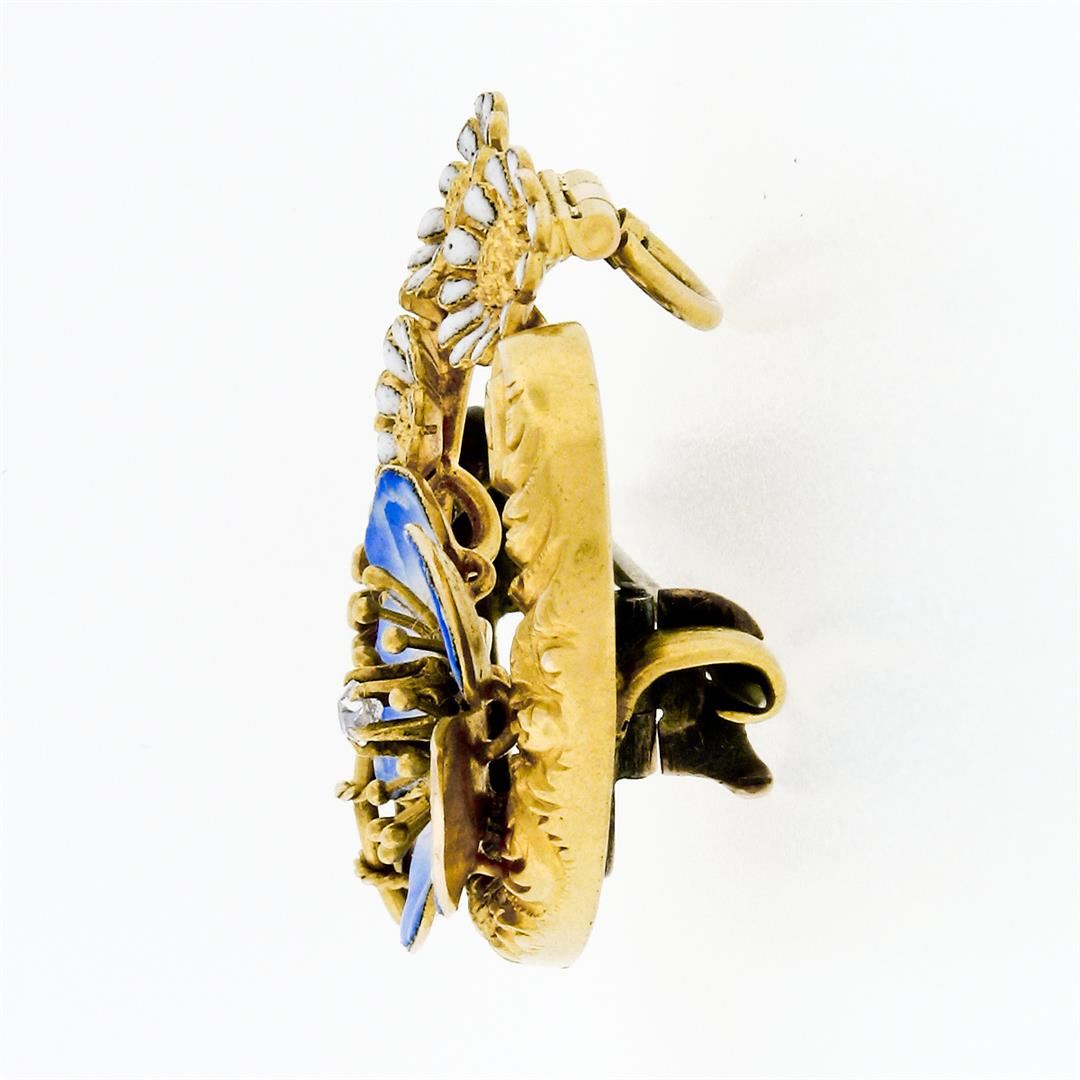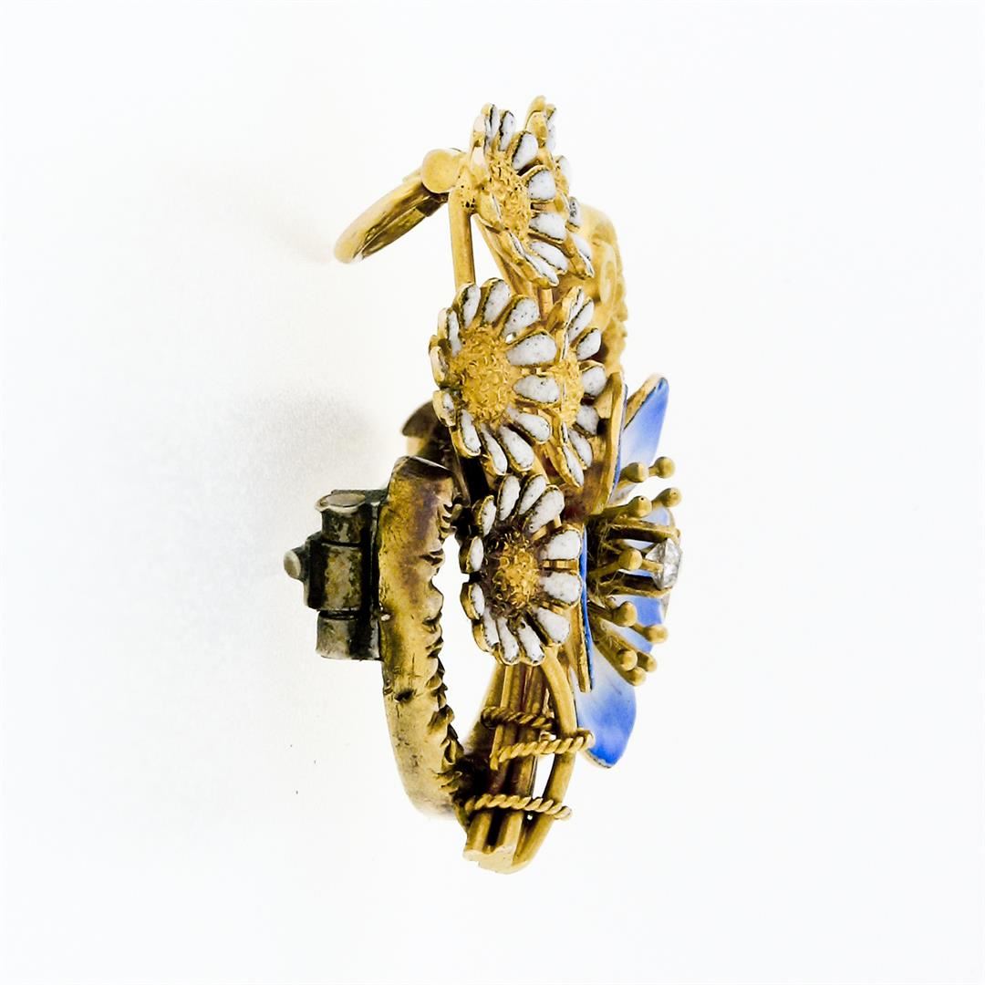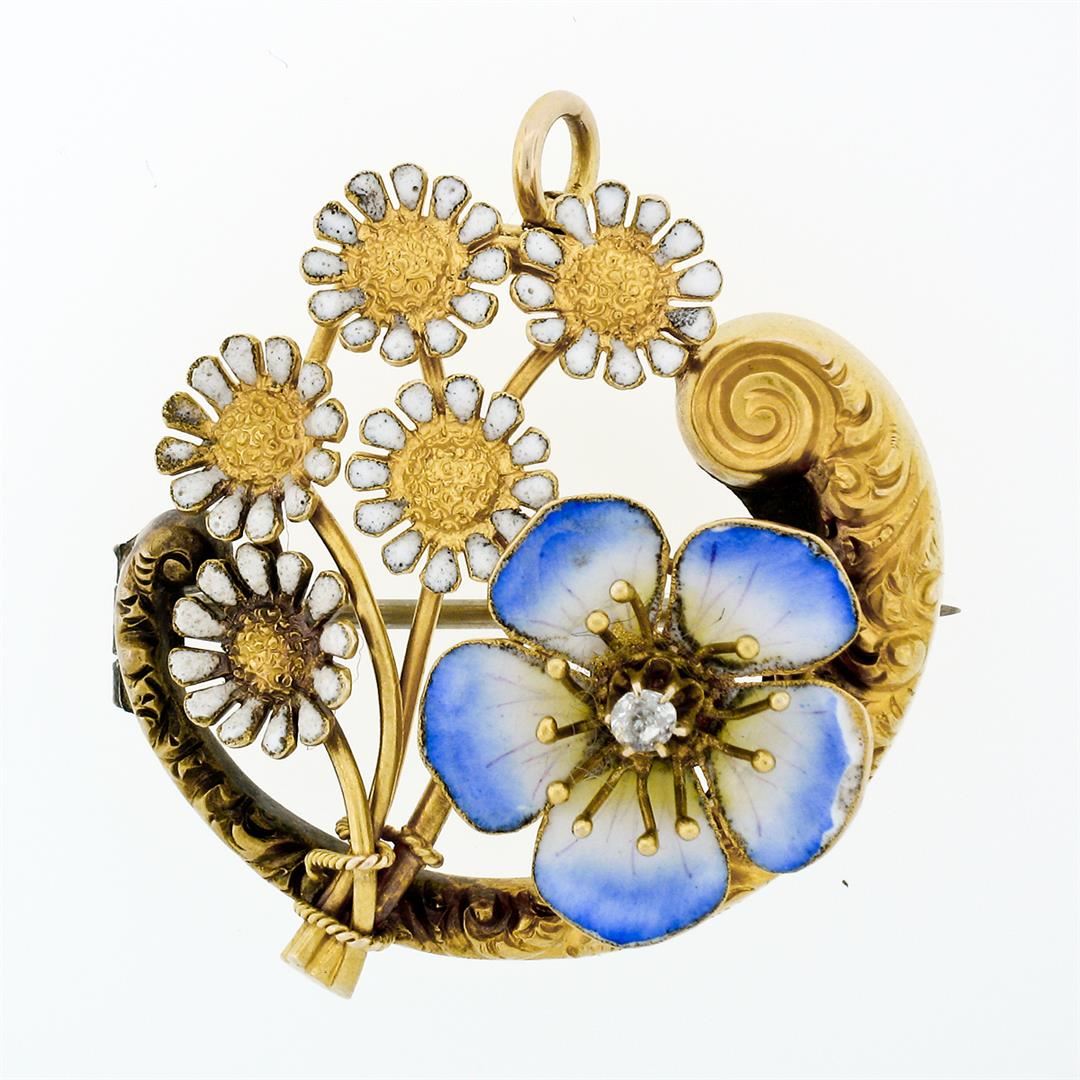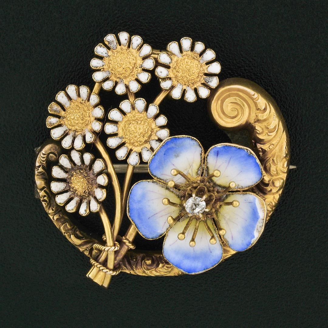 An art nouveau period solid 14k yellow gold scroll repousse brooch with 1 old mine cut natural diamond (G - VS2; 0.04ct) and white with lavender enamel petals. Measures 27.8x27.5mm and weighs a total of 6.18 grams.