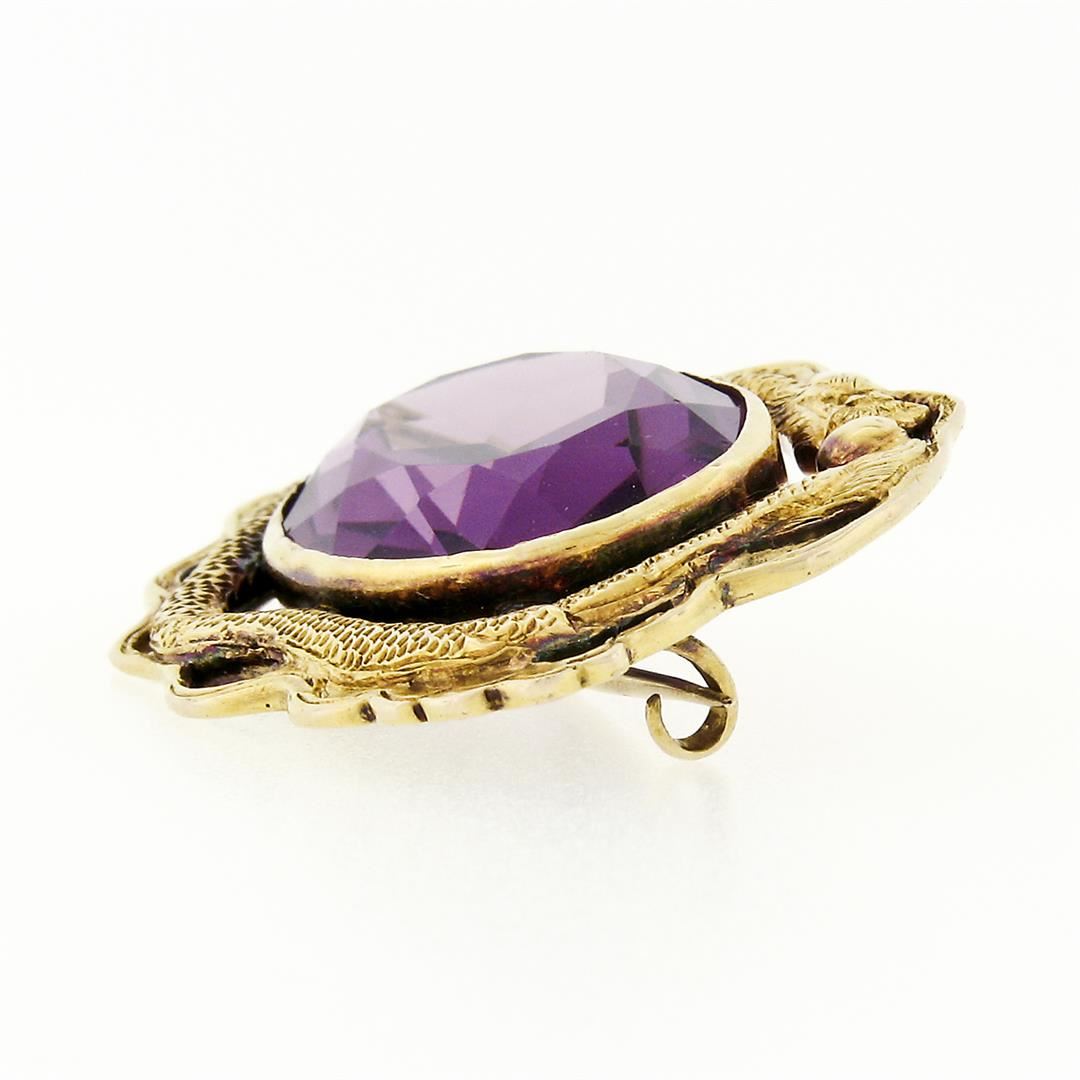 An antique solid 14k yellow gold pin brooch, with 1 oval cut natural amthyst (20.0x15.2mm - 13.13ct). Measures 27.85x35.18mm and weighs a total of 10.95 grams.