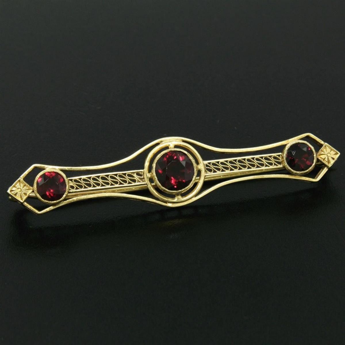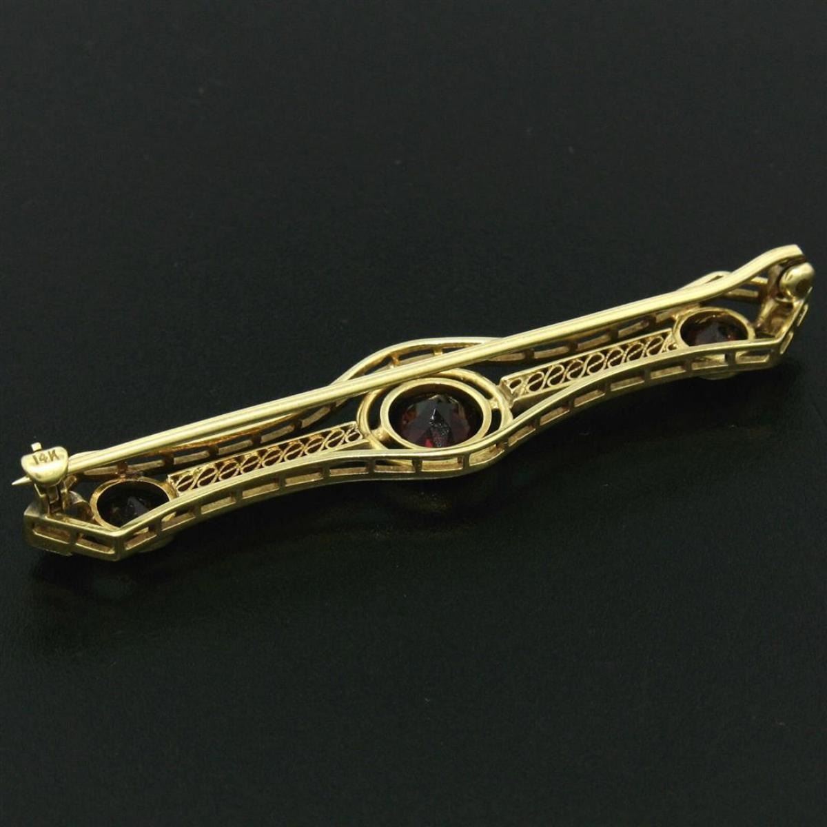 Antique Art Nouveau 14k Yellow Gold 2.20ctw Old Round Garnet Filigree Bar Pin Brooch. A solid 14k yellow gold art nouveau period bar pin featuring 3 round cut natural garnets (1x 6.88mm; 2x5.05mm; 2.20ctw) and an open filigree design. Measures 12.22x58.70