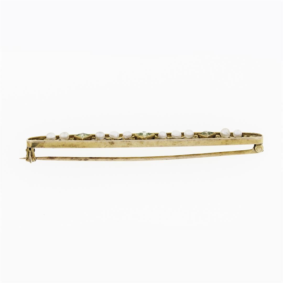 An antique art nouveau solid 14k yellow gold bar pin brooch, with 10 round shape seed pearls (2.50mm), and 3 square step cut natural peridots (3mm & 3.3mm ).Measures 7x63.8mm and weighs a total of 5.0 grams.