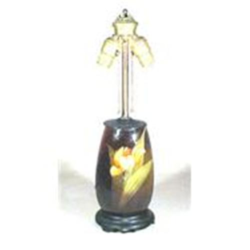 Fantastic table lamp looking every bit like a Weller or Rockwood but marked on the bottom with the impressed mark SO. The bronze base that the lamp is sitting on is marked with what I can see to be the words Munsy Indiana and I believe one of the other words may be Highland Company ? not quite sure. I am sure however that it is a wonderful piece of American art pottery. It is on a very nice bronze base, as I already mentioned, with a scallop cutout base very much in the art nouveau style. The lamp fittings are good and work well with the lamp. It has wiring in what appears to be to me a 1930?s vintage. The pottery itself is in very good condition having only one light surface crazed marked from the top of the lamp fitting to the tip of the leaf on the left side ? you have to turn it in a specific light to pick-up that crazing line. Otherwise the lamp is deserving of a wonderful shade! The lamp base measures 9? high the lamp from base to the top of the electrical fitting measures 18?. The diameter of the lamp base is 6?.