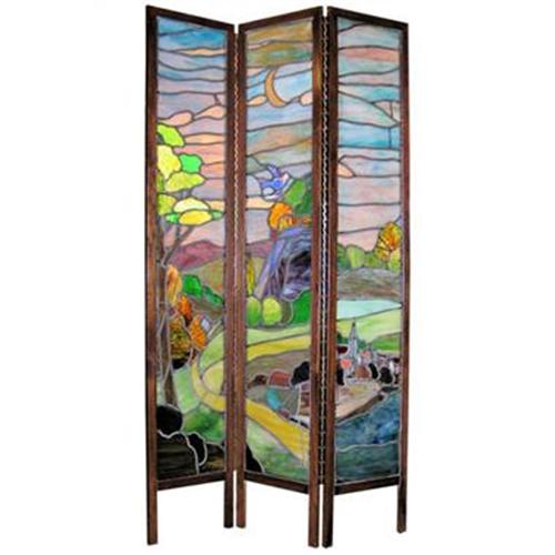 These three-panels of stained glass were recently set within new, stained wooden frames with polished brass hardware. Glass dates from around the turn of the century and features a church in the lower right panel, a lush landscape with rich foliage and walking path, and multi-colored blue sky with bird and cresent moon in the upper left panel. Measures 72" high and each panel measures 14" wide and 3/4" deep. Lower portion of the screen was lit from behind when photos were taken. This item resides on the upper west side of Manhattan ( New York city ) and may be seen by appointment. Thanks for visiting. Please let us know if you have any questions or comments.