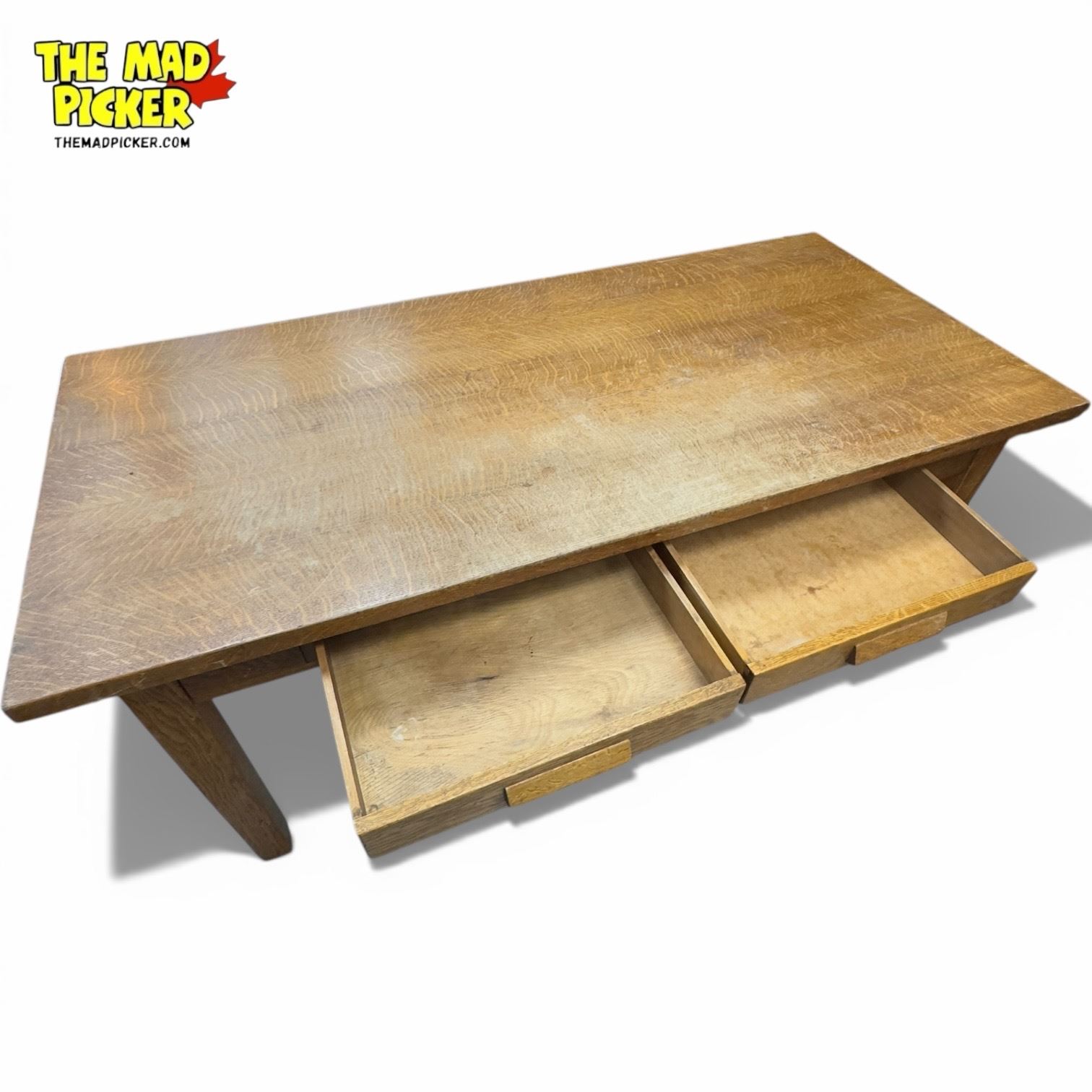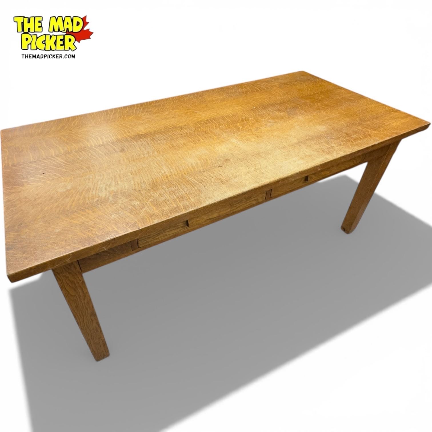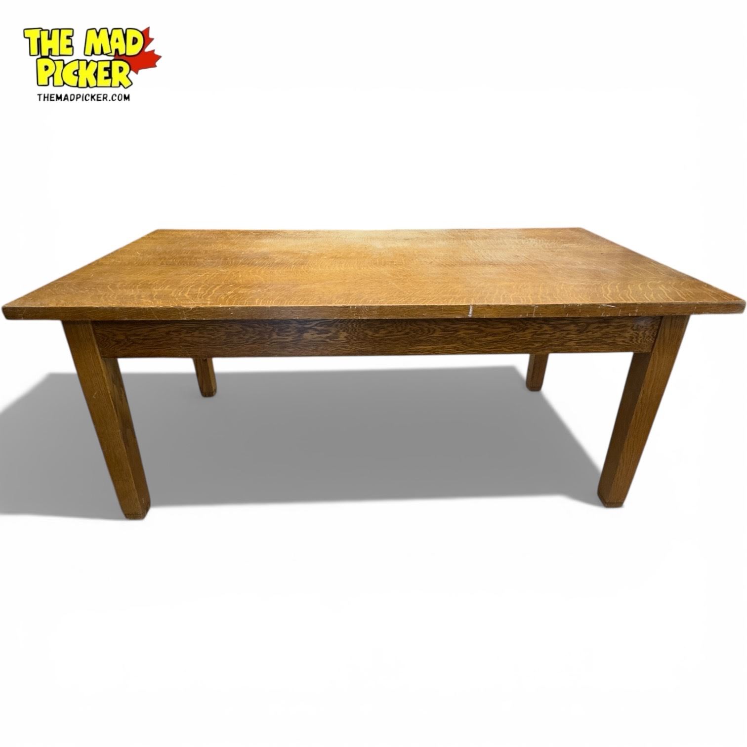 Antique Arts & Crafts-style oak library table from the early 20th century. Features solid oak construction with approximate dimensions of 72in length, 34in depth, and 30.5in height. Notable for its clean lines and craftsmanship characteristic of the Arts & Crafts movement.