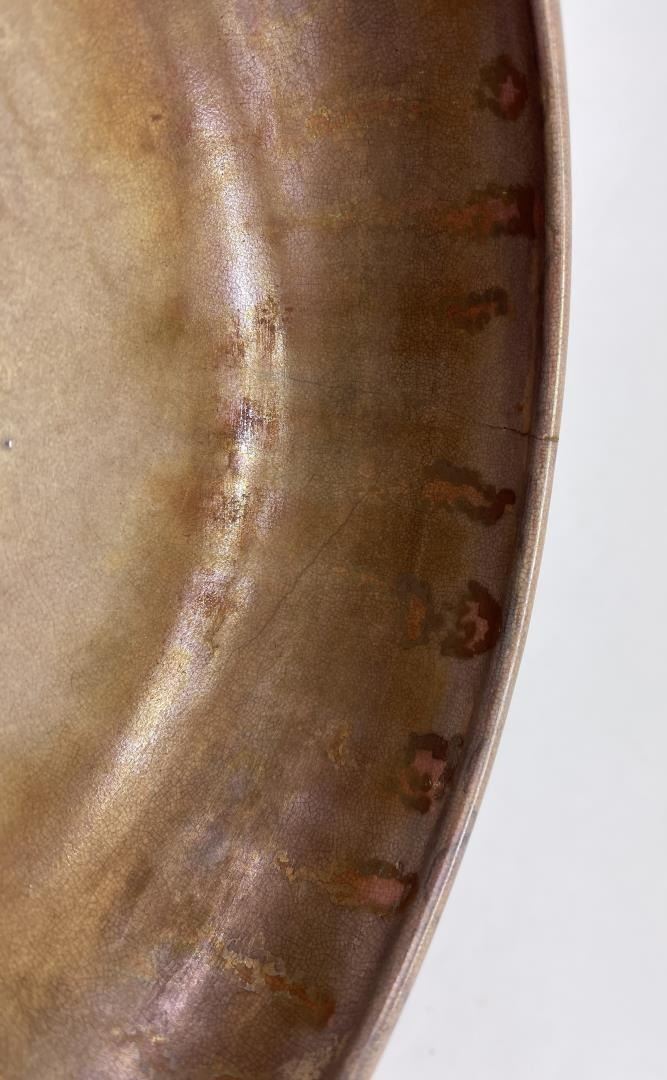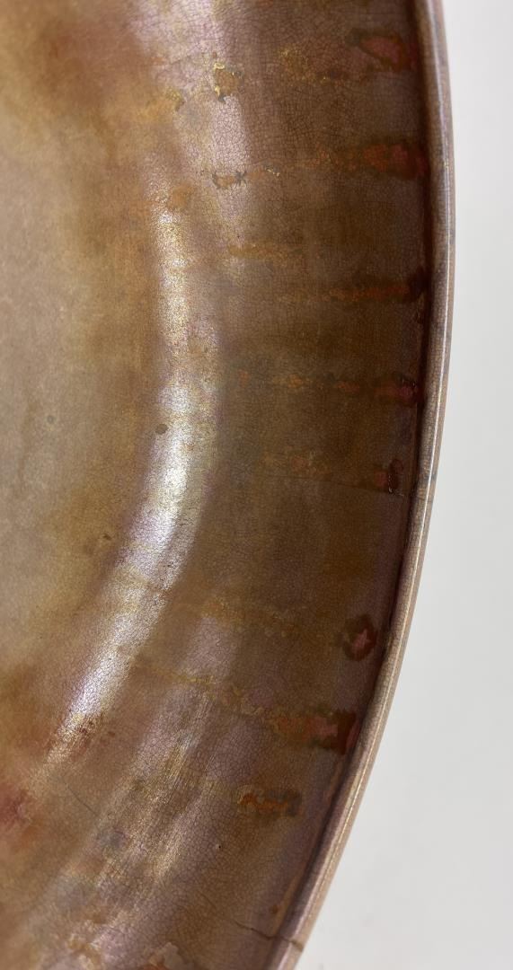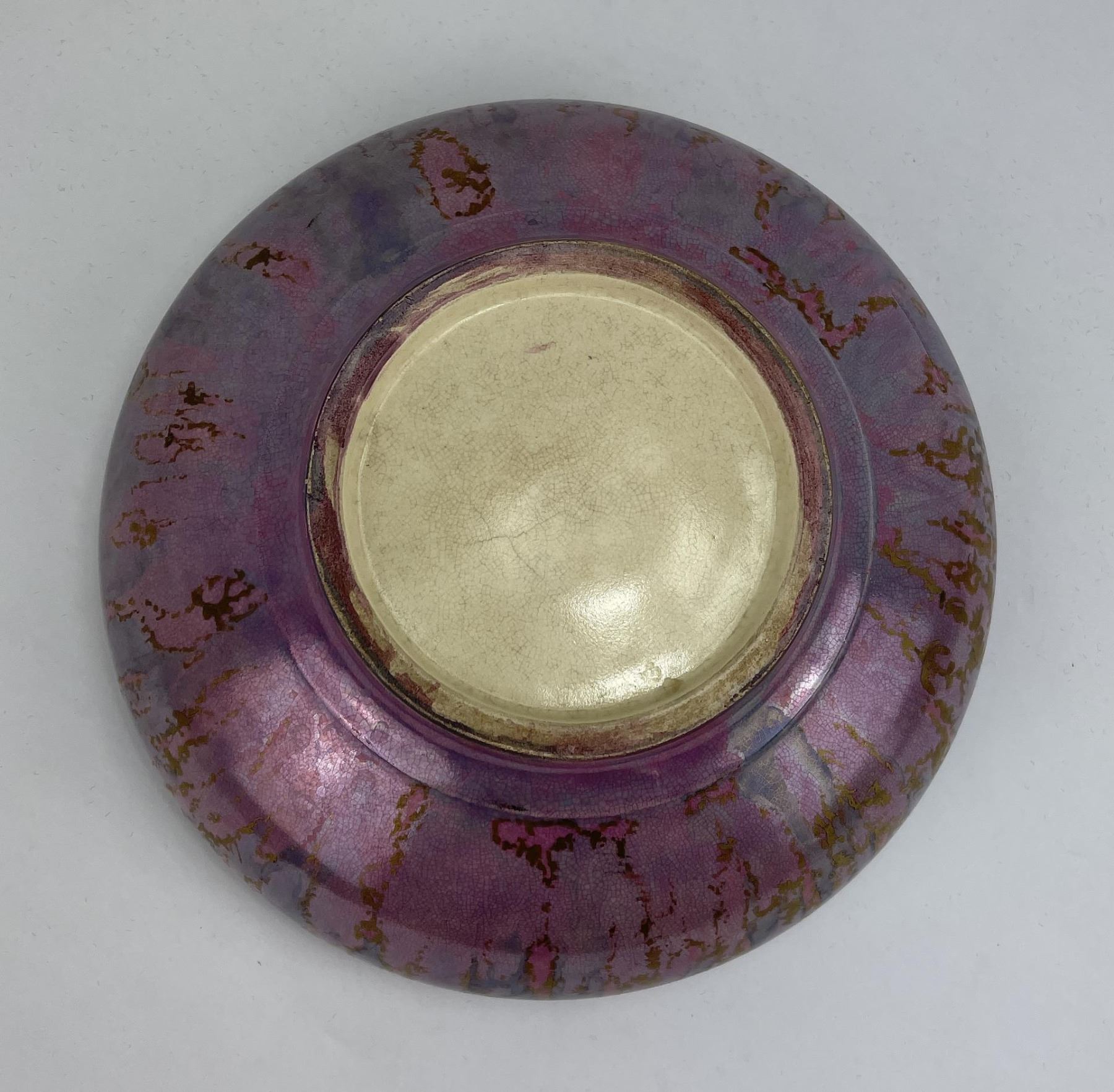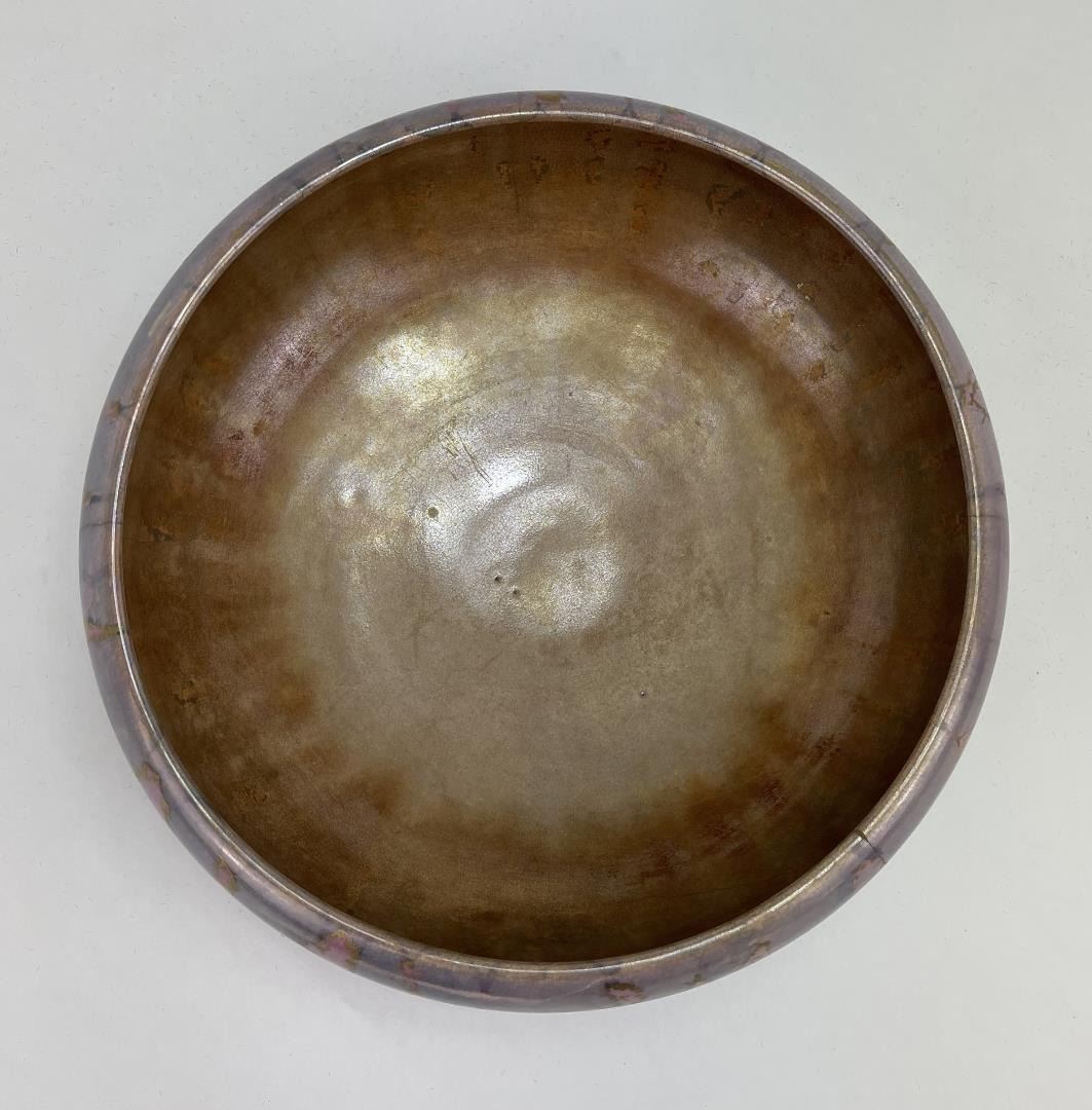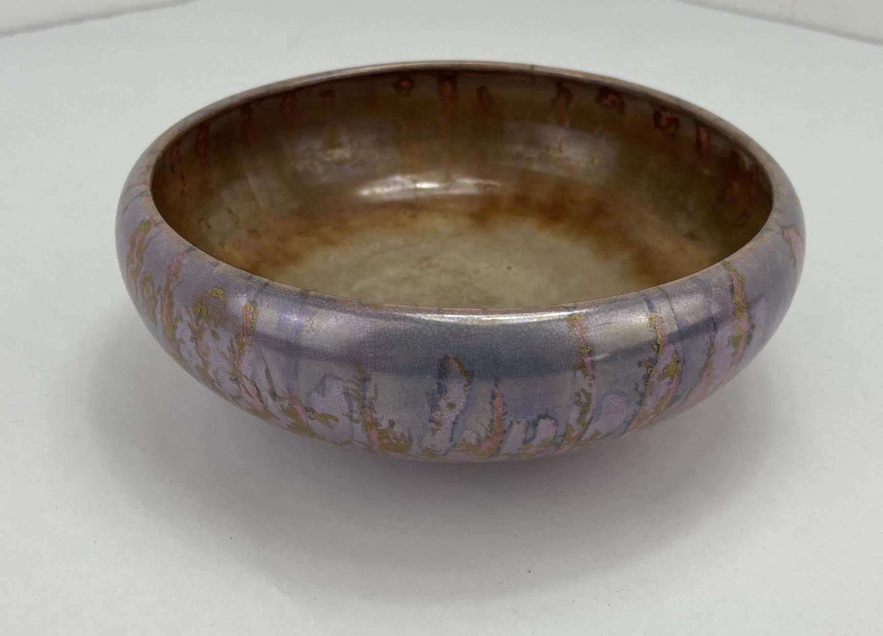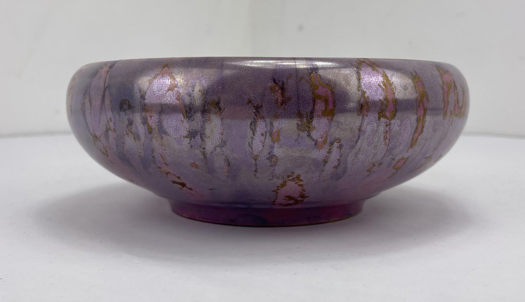 Very nice old bowl. Unknown maker. Drippy glaze with metallic gold. Very finely made. Bowl is cracked as shown. 8.75" diameter.