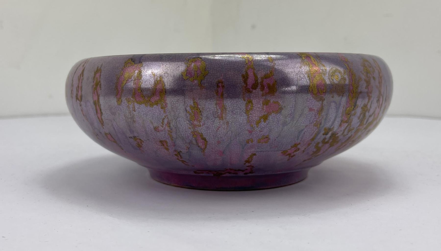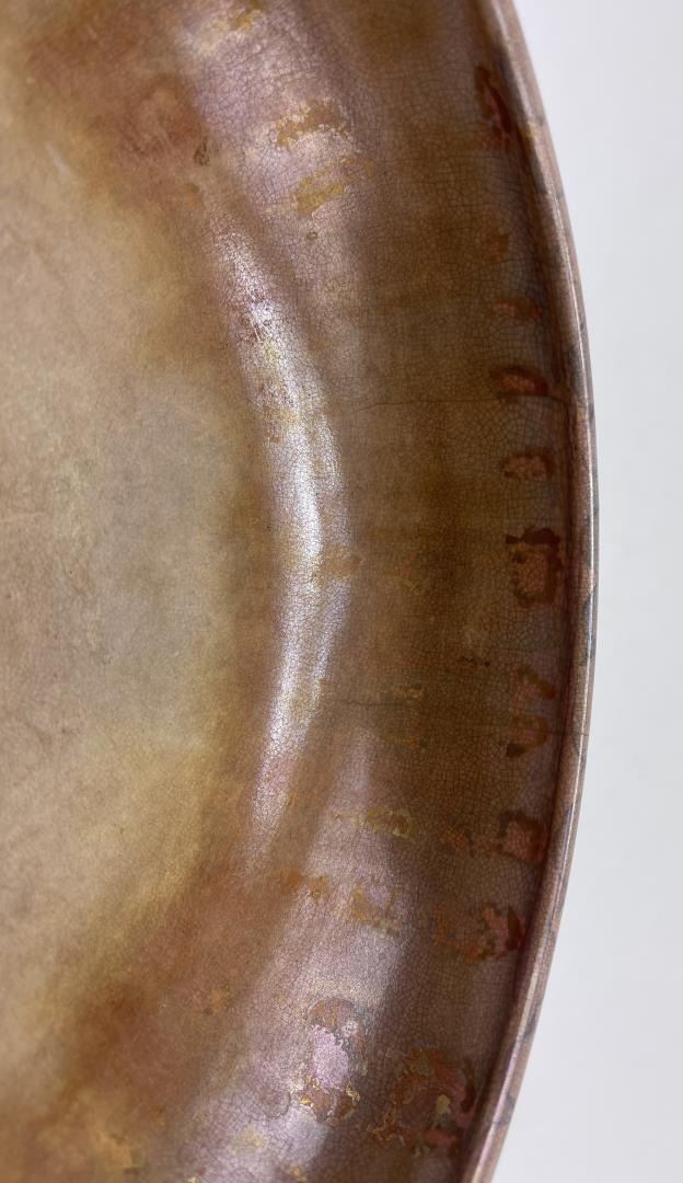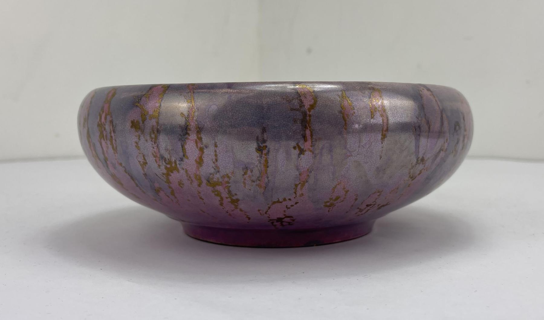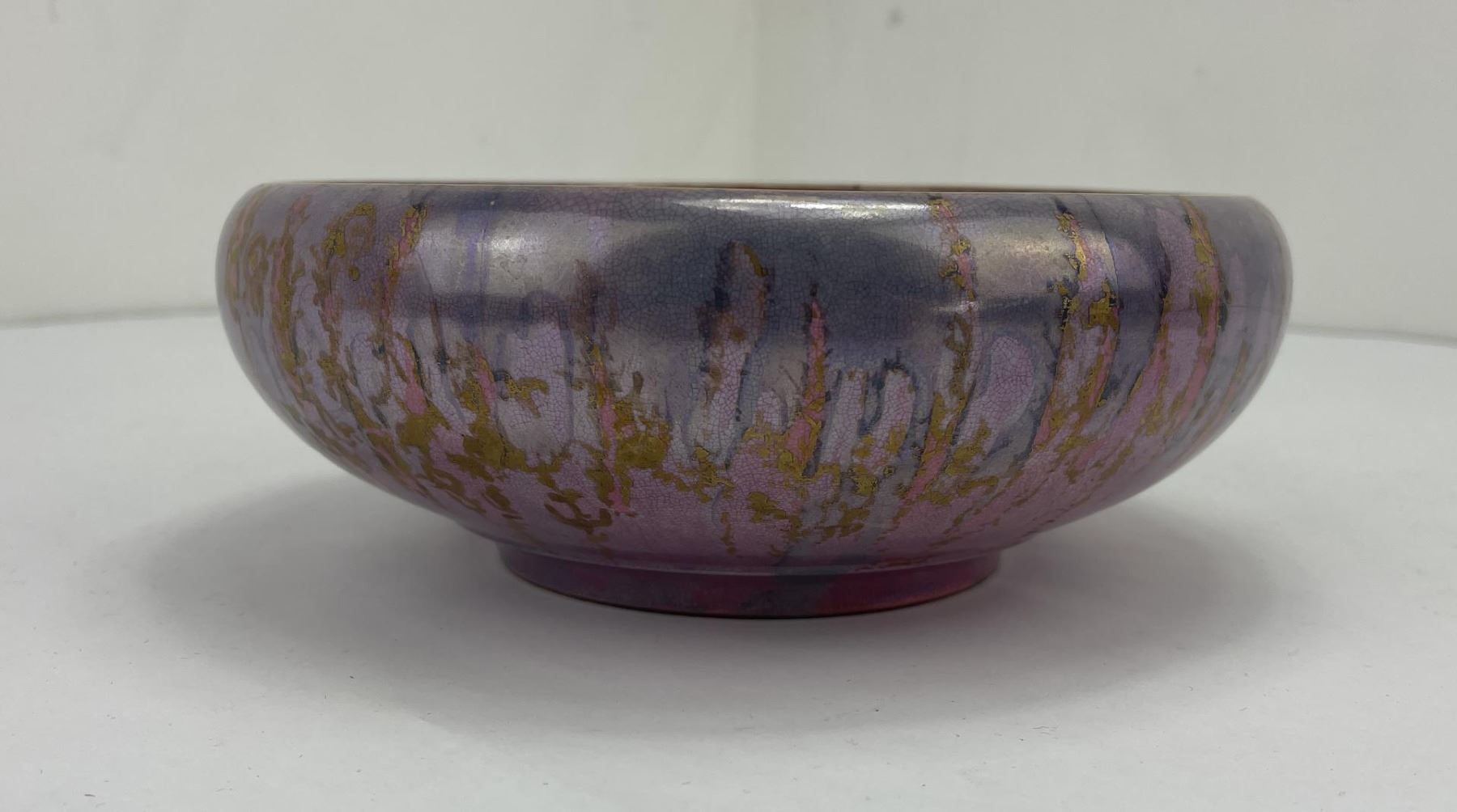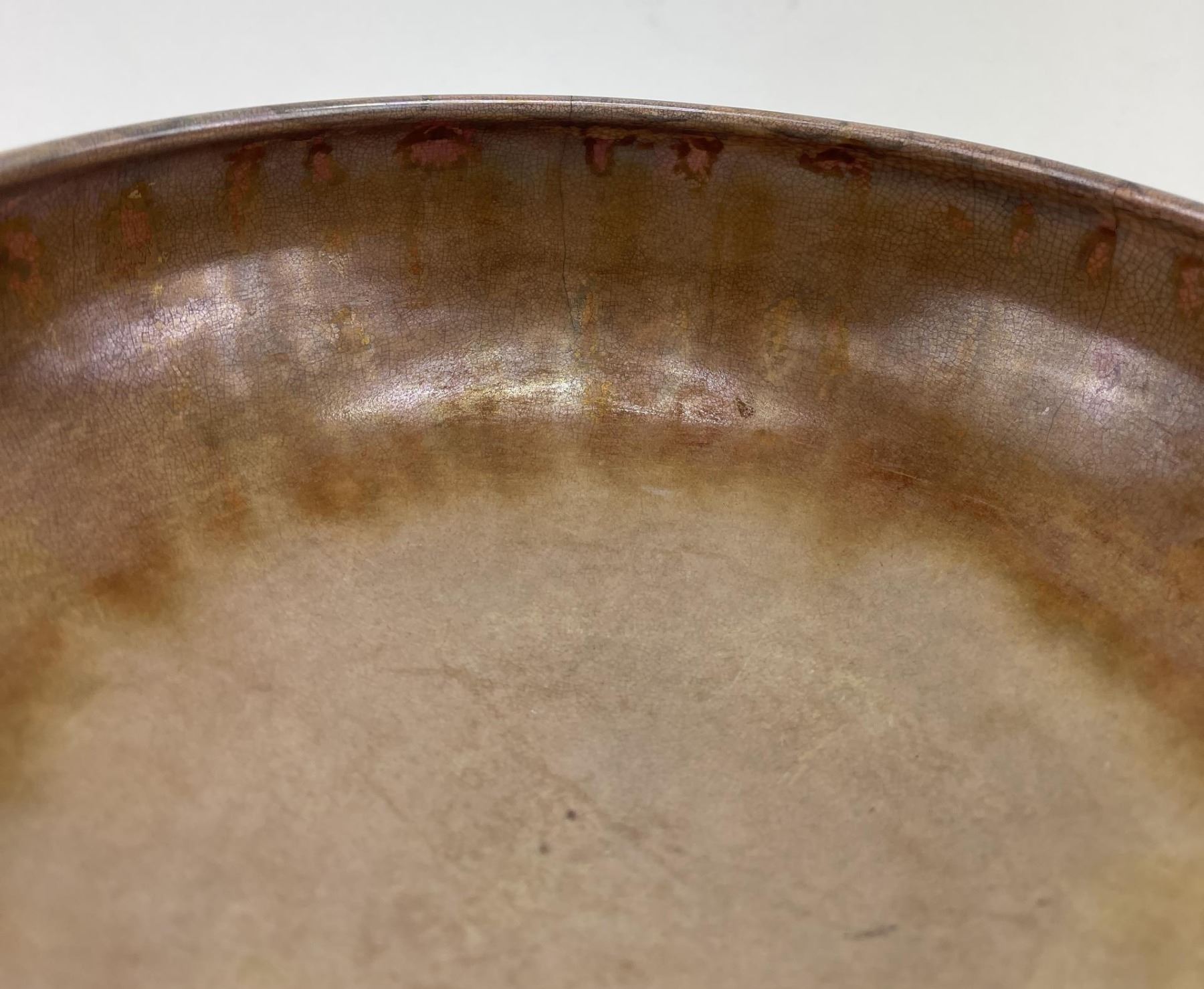Very nice old bowl. Unknown maker. Drippy glaze with metallic gold. Very finely made. Bowl is cracked as shown. 8.75" diameter.