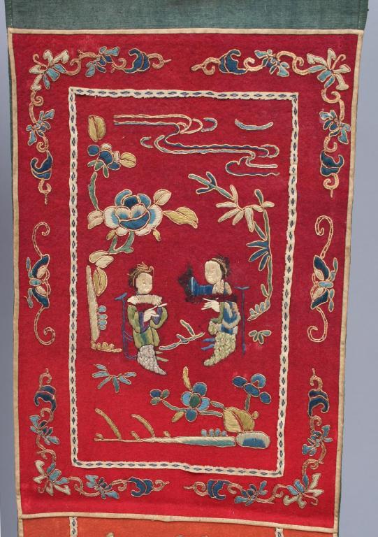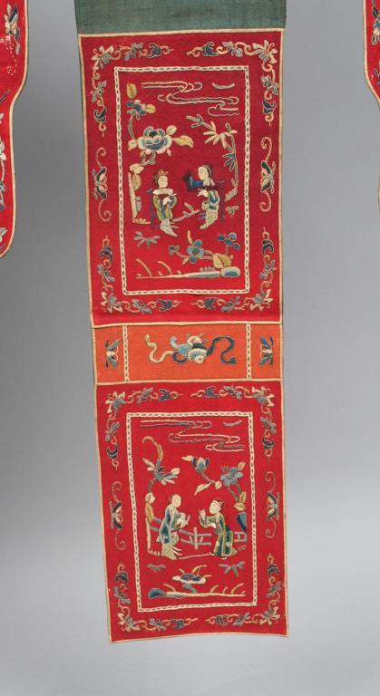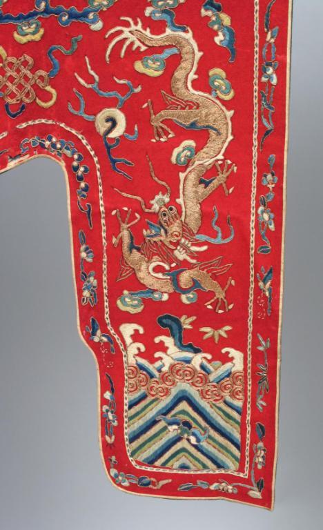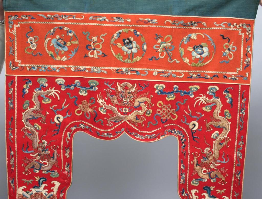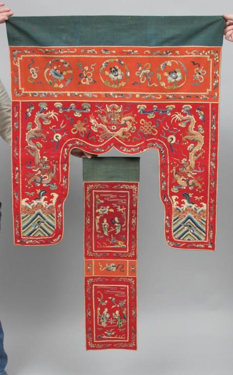 Circa 1900, with iron red and crimson felt embroidered with trophies, dragons, and swirling clouds in polychrome, with gilt thread; together with a single rectangular similar panel. "U" shaped panel 36"L. 30"W. Single Panel 33"L. 9"W. Condition: very good, some light wear to threads, generally excellent.