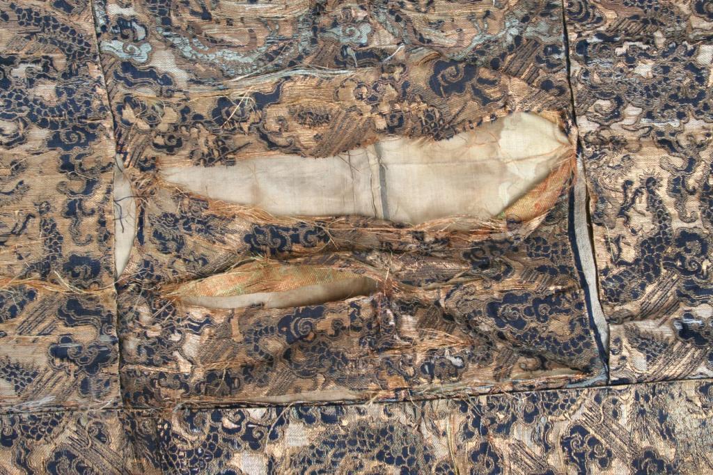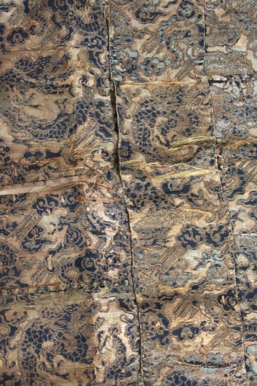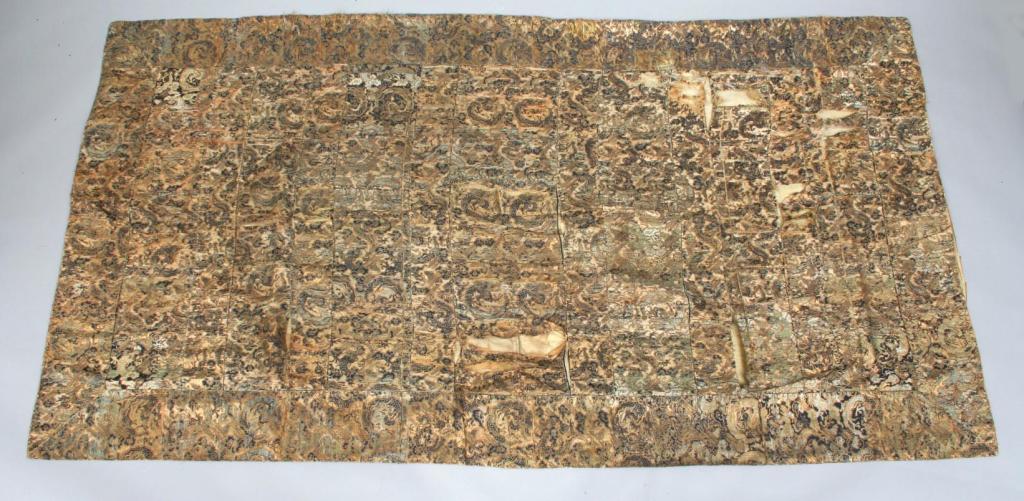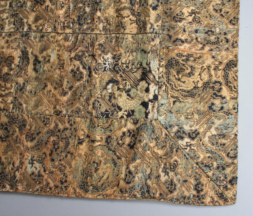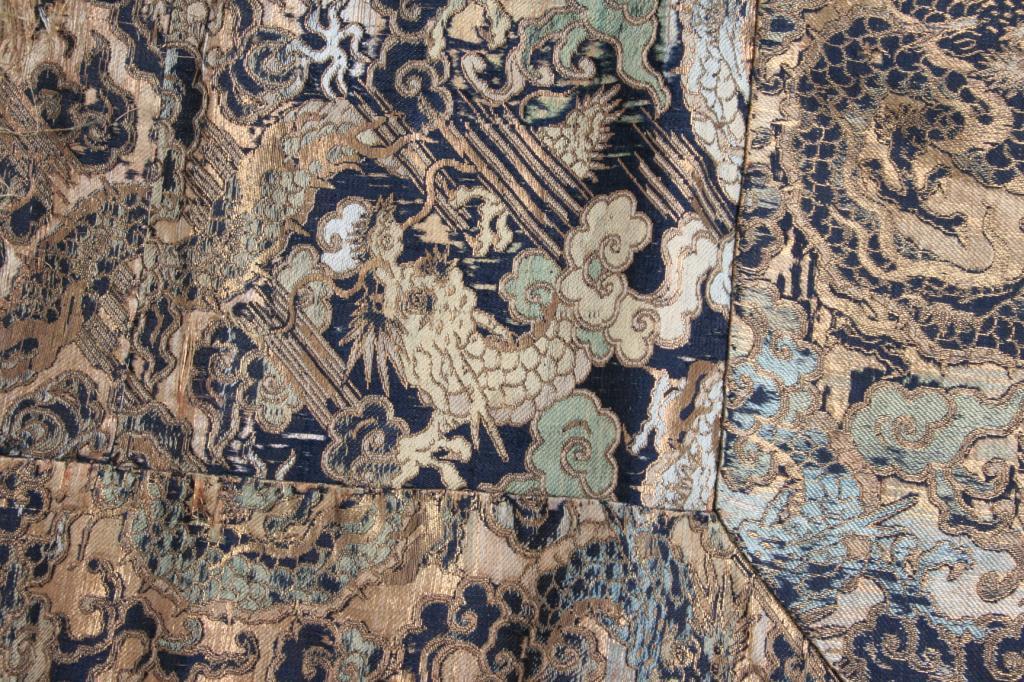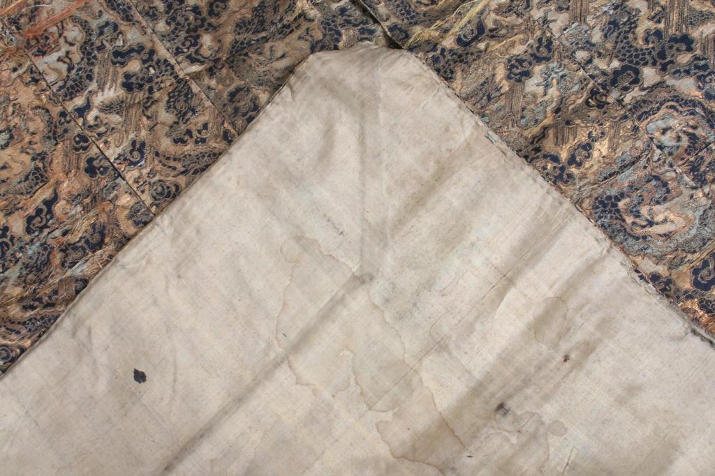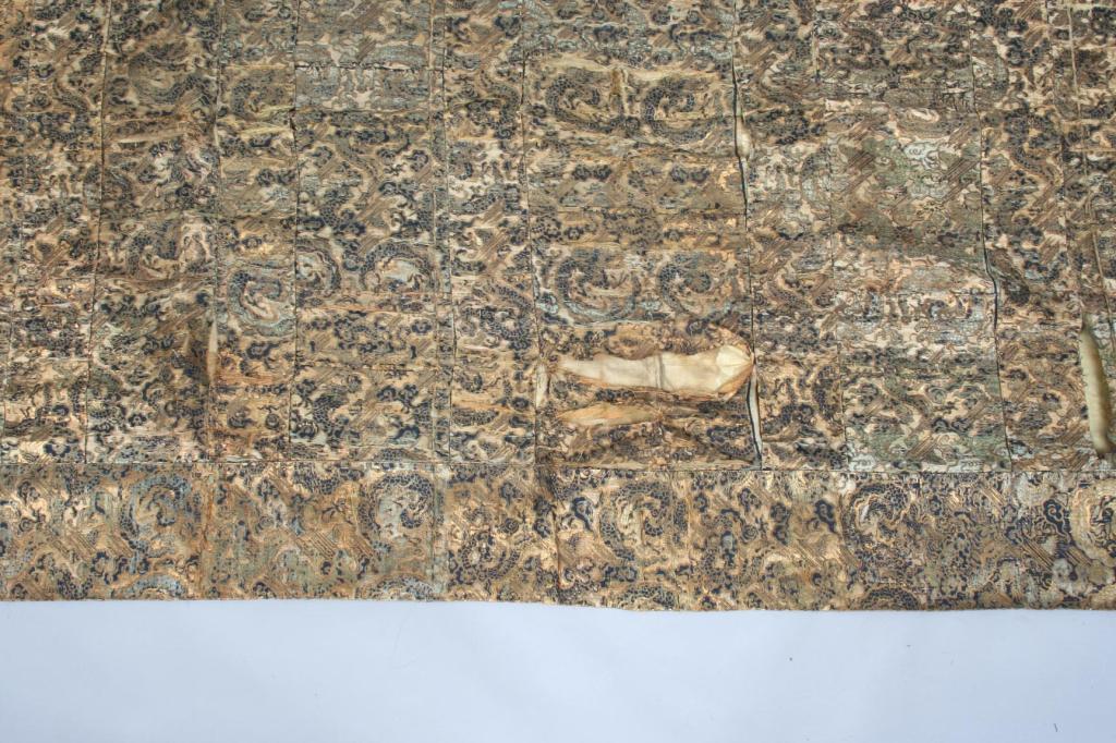 With dragons, clouds, and scrolling foliage in gild on a green ground, pieced together and backed in silk . 80" x 44". Condition: multiple tears to fabric, several seams loose, wear to threads, back with patches and some stains.