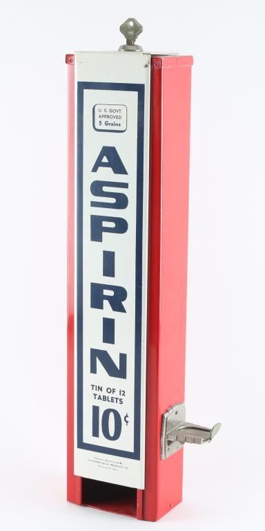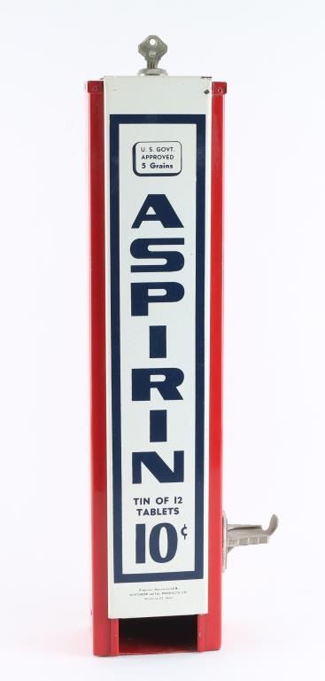 Manufactured By "Winthrop Metal Products CO.", can fit 52 aspirin containers. Includes key for refill, functions with dime coin. Red and white and blue paint in good condition.