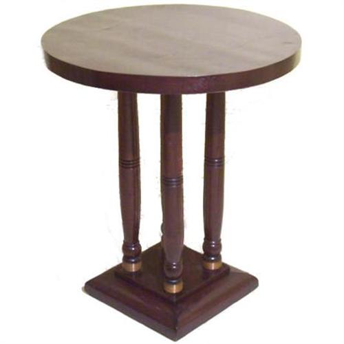 This art deco table comes from Austria and dates from circa 1930. Measures 28" high by 24.5" in diameter. Features four turned legs, decorated with brass wire rings, and set upon a rectangular base. Refinished. Rich brown color with reddish tint. Believed to be made from mahogany. Just a little wobbly, but still structurally sound.