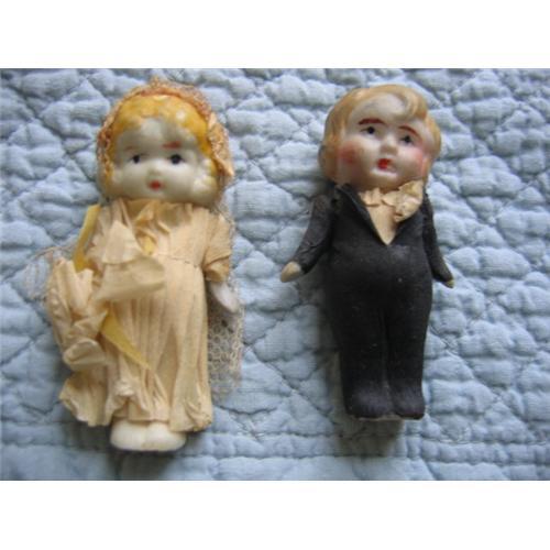 This is an adorable little pair of bisque jointed Bride & Groom Dolls that were likely to decorate a wedding cake, though they appear to have never been used. They are only 2 3/4 inches high. Sporting the wave hair style fashinonable in the Roaring Twenties, the bride's dress is made of creamy-white crepe paper; her veil is a thread mesh; and she has a crimped ribbon circlet around her hair. The groom wears a black crepe paper, form-fitted suit with a creamy-white crepe flower in the lapel. They have jointed arms attached with wire, and sweet hand painted faces. They are in excellent to near mint condition!