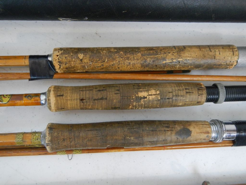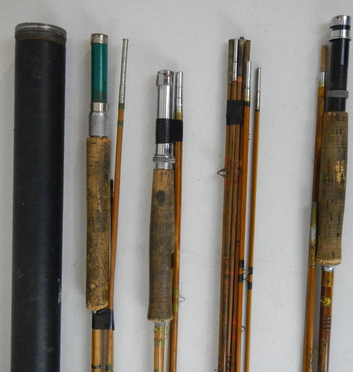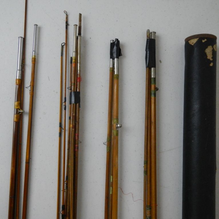 This lot features 3 Rods sets, a tube, and various rod pieces. All of these are split bamboo trout fly rods. Each rod shows wear and might have damage. These include a Montague Rapidan, JC Higgins, and another rod. This all sells together.