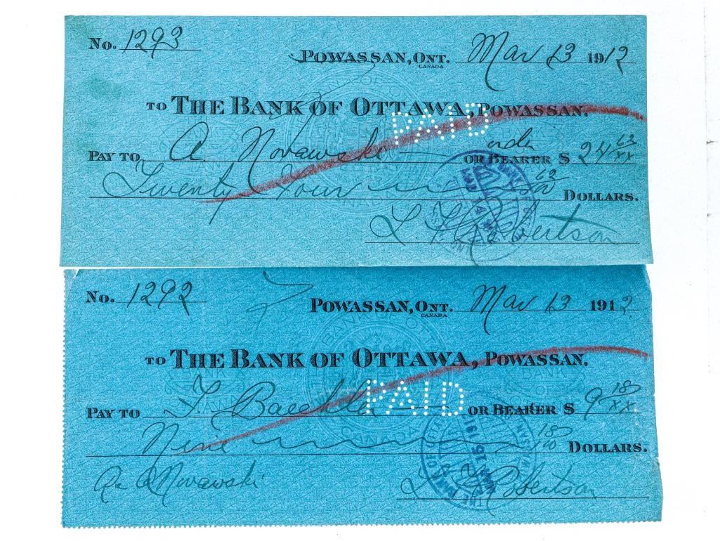 Antique - Bank of Ottwaw, POWASSAN. 2 x Cheques Dated March 1912 - Over 110 Years Old