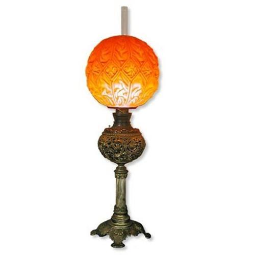 Banquet lamp with an ornately designed base, stone (we believe it is onyx) column and drape style shade. It was converted from oil to electric and the wiring is old but it works fine and has not deteriorated. There is the number 75 on the underside of the base. We cannot guarantee that both shades are original but we strongly suspect they are. The hurricane shade has imperfections in it such as a bubble along the top ridge and there does not appear to be any seams in the heavy orange shade. There are a few small chips in the bottom of both shades where they fit into the lamp and they are not visible when the shades are in place. This is a very nice lamp! Circa 1880. Approximate measurements 33.75" tall, 7.5" wide.