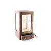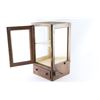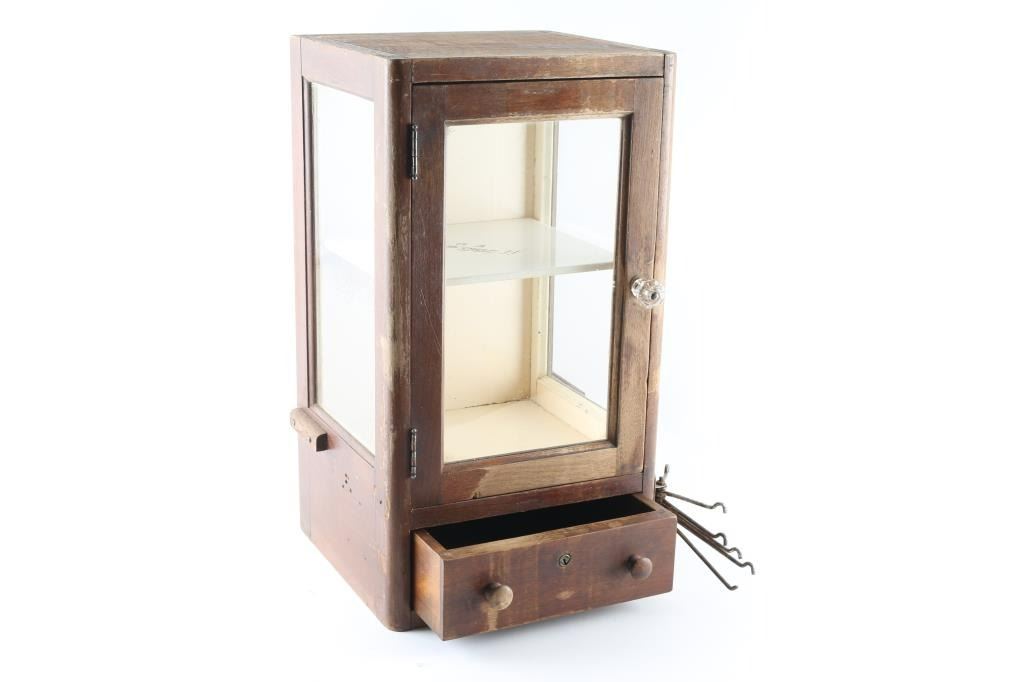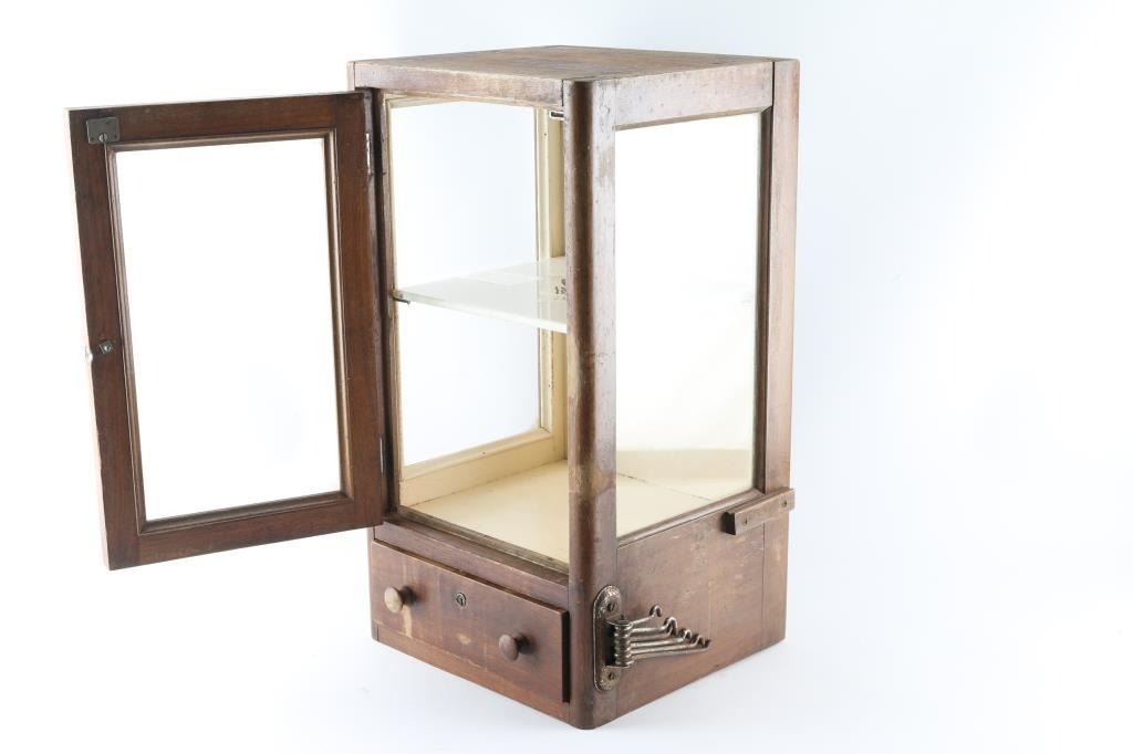 Wood construction, 3 glass panels, with enameled shelf and lockable drawer and measures 22x12x11"