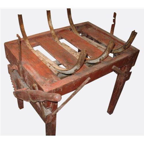 A lever can be pulled to one side to move the curved metal top pieces closer together. These pieces extend up 8 inches. This is where the barrels would be constructed and squeezed tight. There are metal supports on the base and chains and a metal bar hang below the base.