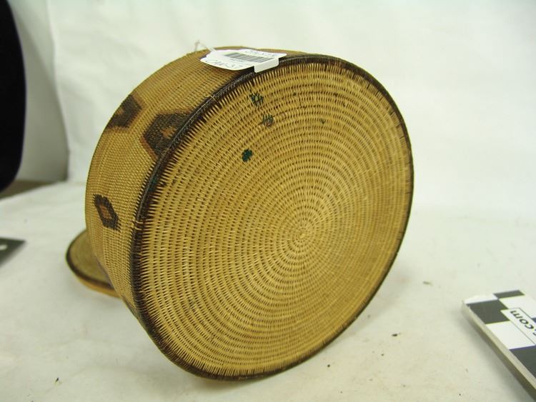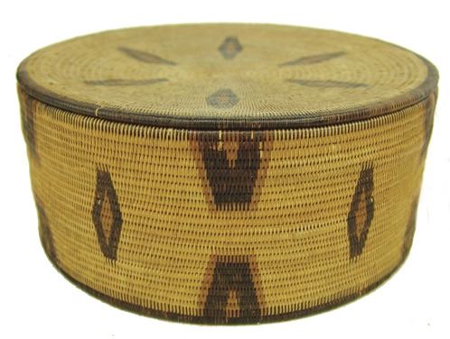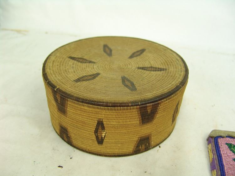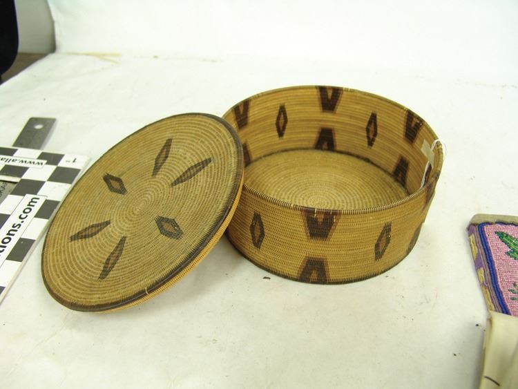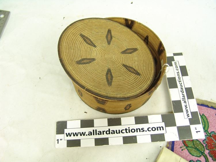 Very fine single rod lidded basket four repeating two-color diamond designs. Very good condition. Very minor stitch loss/damage.,Early to Mid 1900s,3-1/4" x 7-1/4"