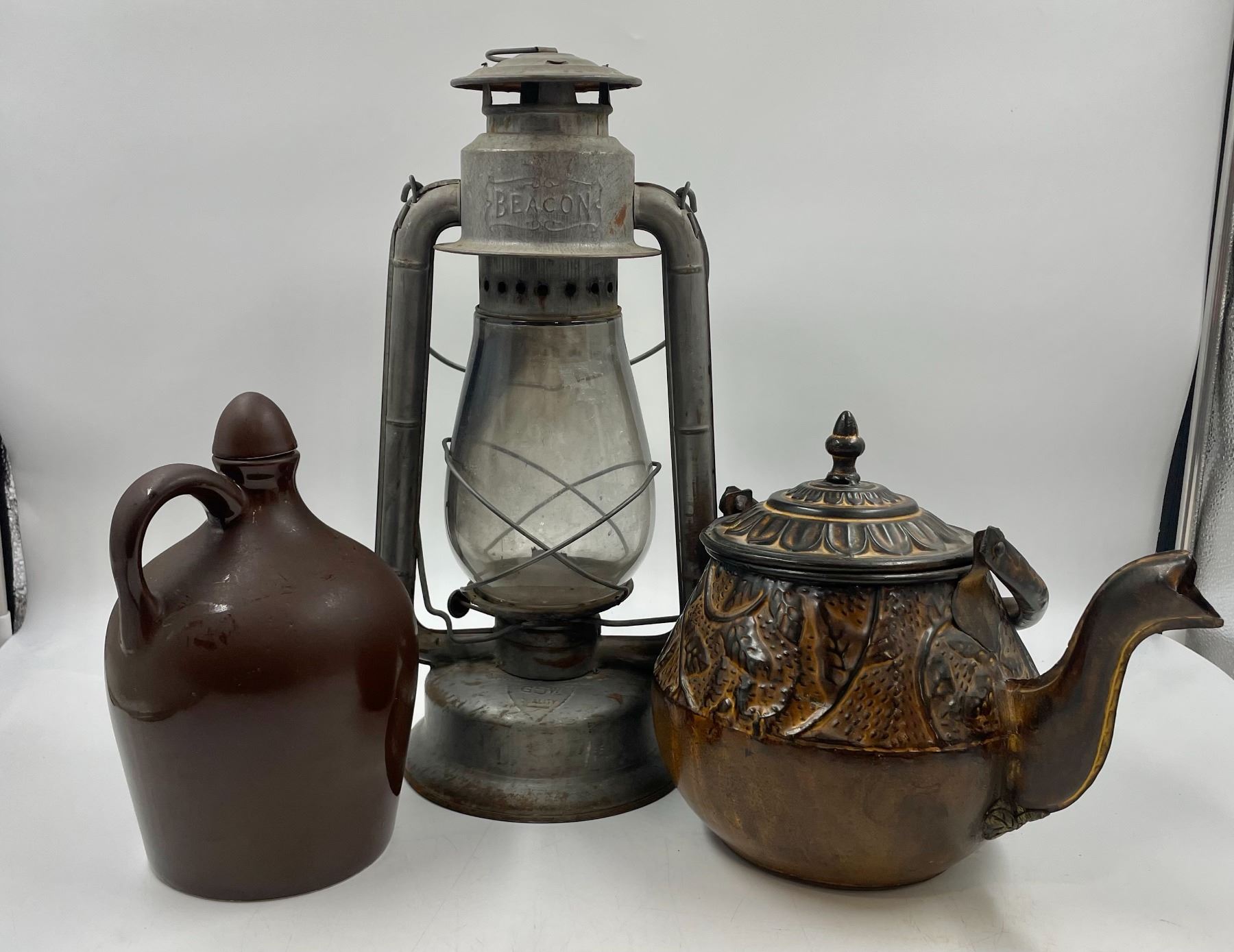 Antique Beacon Lantern 21" Tall, Embossed Tea Kettle, & Pottery Jug