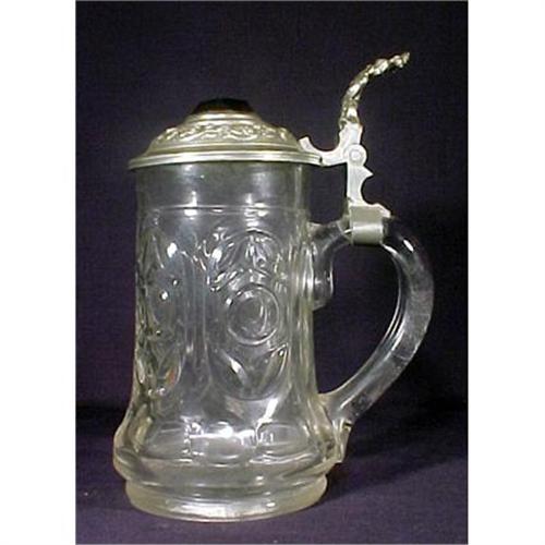 Here is an absolutely stunning 19th century pressed glass stein. It is ornately set with a faceted amber colored glass jewel. It may be real amber I?m not sure. On top of the lid in script it reads S. Soheron and dated 1884. Now my translation of what I can read of the name on the top of the lid may be wrong but the date is very clear. Surrounding the amber facet jewel on the top is a design in high relief of oak leaves and acorns. As you can see the design in the mold of the glass is very elegant and it has an unusual nice shape to the bottom. The stein is in good condition and it measures 8? at highest with a base diameter of 4?.