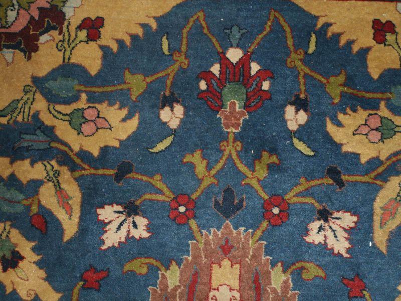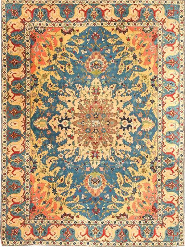 8.05 x 11.02 Early twentieth century Antique "Benlian" Tabriz Carpet, Persia - This extravagantly beautiful antique Tabriz was produced in the workshop established in Tabriz by the British-Armenian firm of Benlian, whose distinctive star cartouche is visible in the upper lefthand corner of the inner minor border. The field design consists of an almost windblown leafy medallion filled with delicate vines and flowers. Similar forms on a larger scale comprise the cornerpieces with a lovely sky blue ground in the intervening space, filled sparingly by additional vines and flowers. A stunning classical Persian arabesque border frames the entire composition, utilizing the same blue and cream tones, but punctuated by red outlines for added effect or emphasis. A flawless combination of superior design and color.